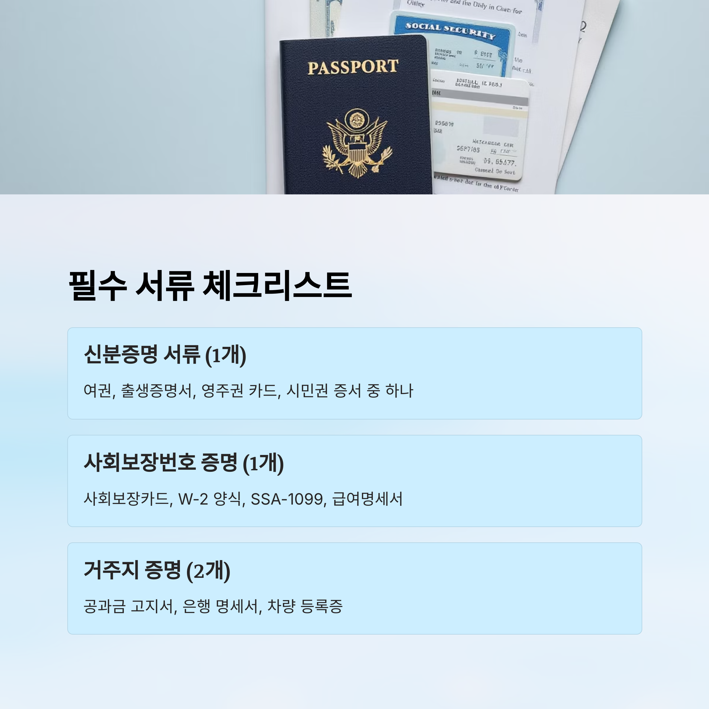 두 번째로는 사회보장번호(SSN)를 증명하는 서류예요. 대표적으로 사회보장카드, W-2 양식, SSA-1099, 급여 명세서 등이 해당돼요. 반드시 본인의 SSN이 명확히 기재되어 있어야 해요.