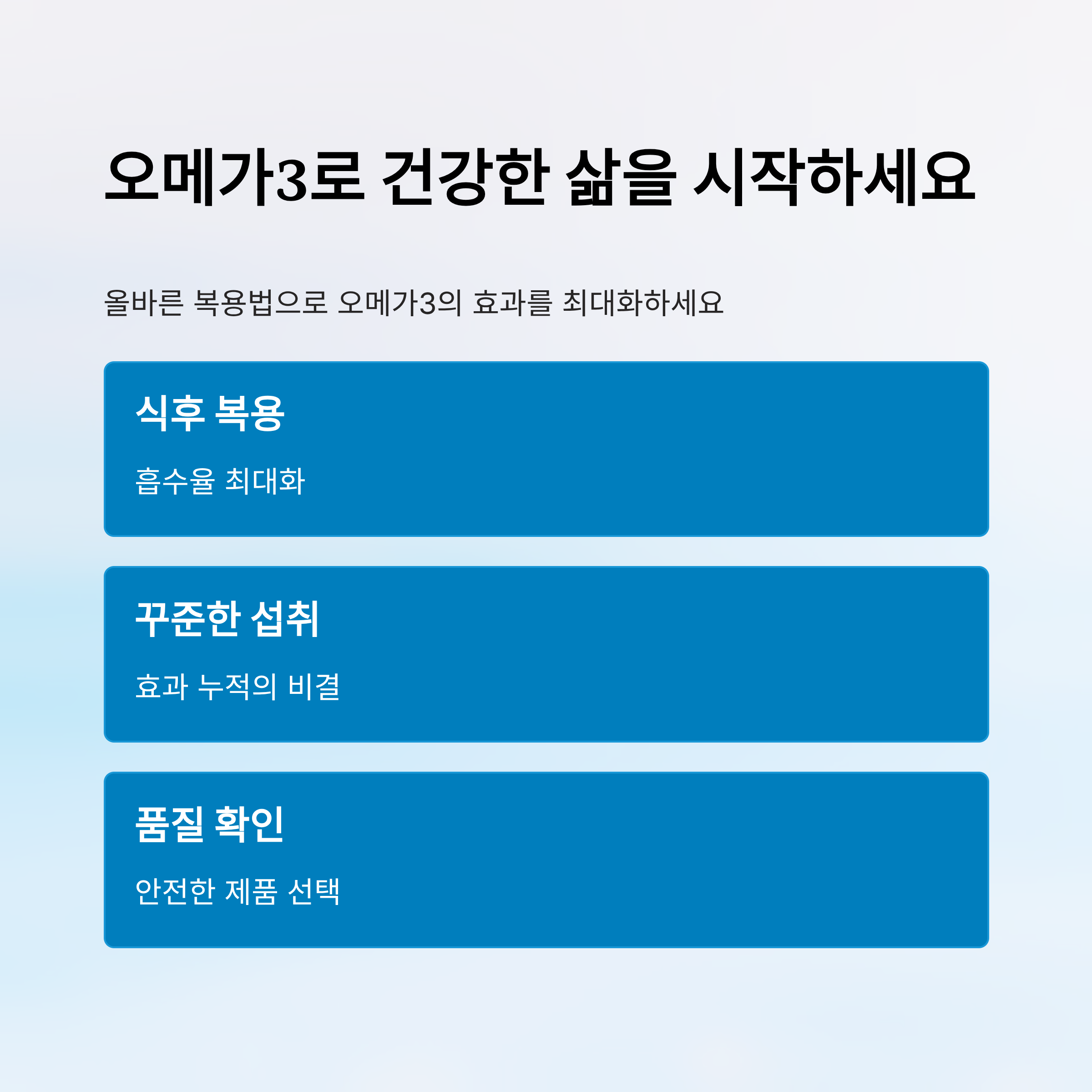 결론적으로 오메가3는 식사 후에 복용해야 하고, 특히 지방이 포함된 식사와 함께 먹는 것이 흡수율과 효과를 높이는 비결이에요. 규칙적인 시간에 복용하는 습관을 만들어보세요. 😊