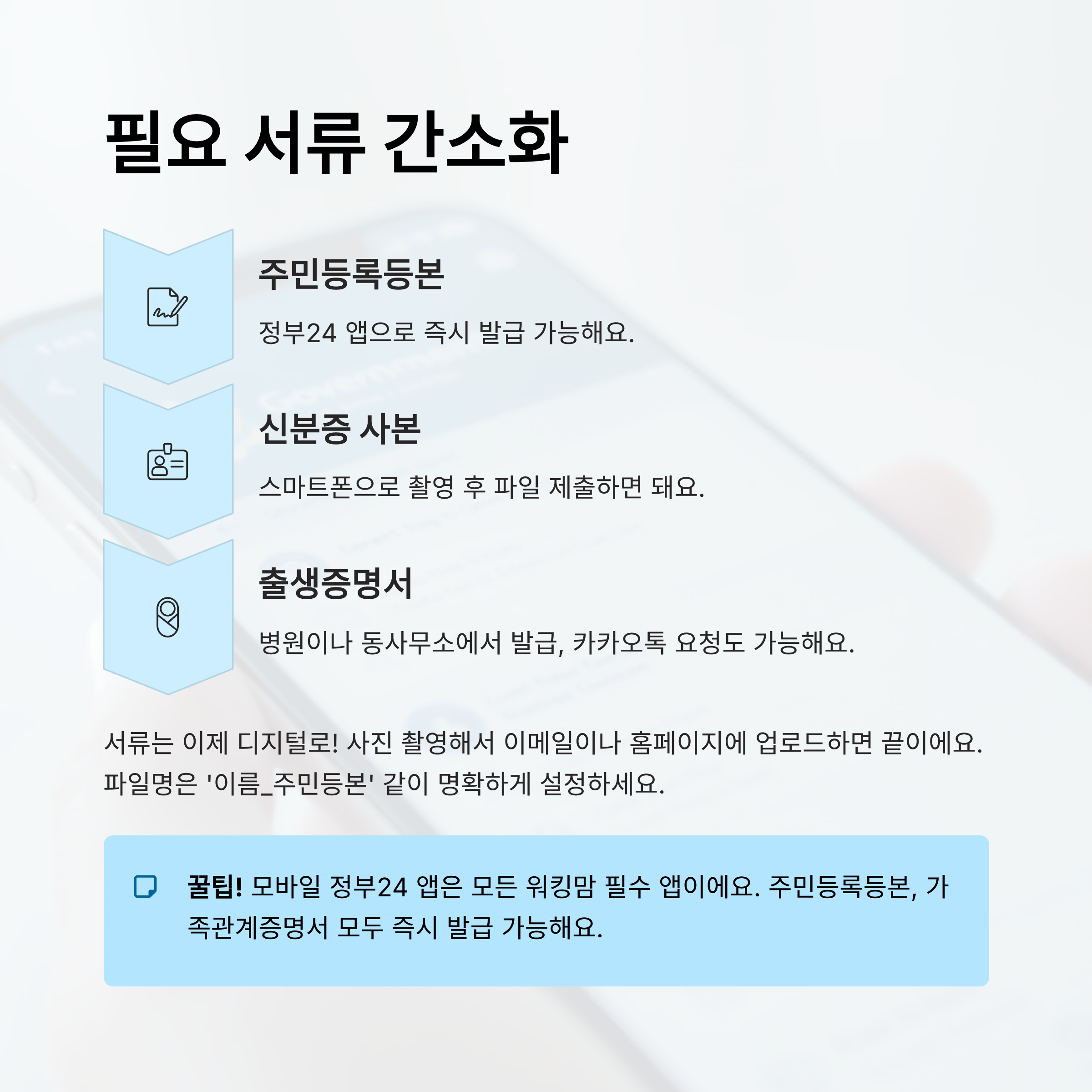 간소화 팁 중 하나는 '모바일 정부24' 앱 이용하기예요. 주민등록등본, 가족관계증명서 모두 모바일로 발급 가능하고, 바로 제출도 가능하답니다. 이건 진짜 모든 워킹맘 필수 앱이에요 📱