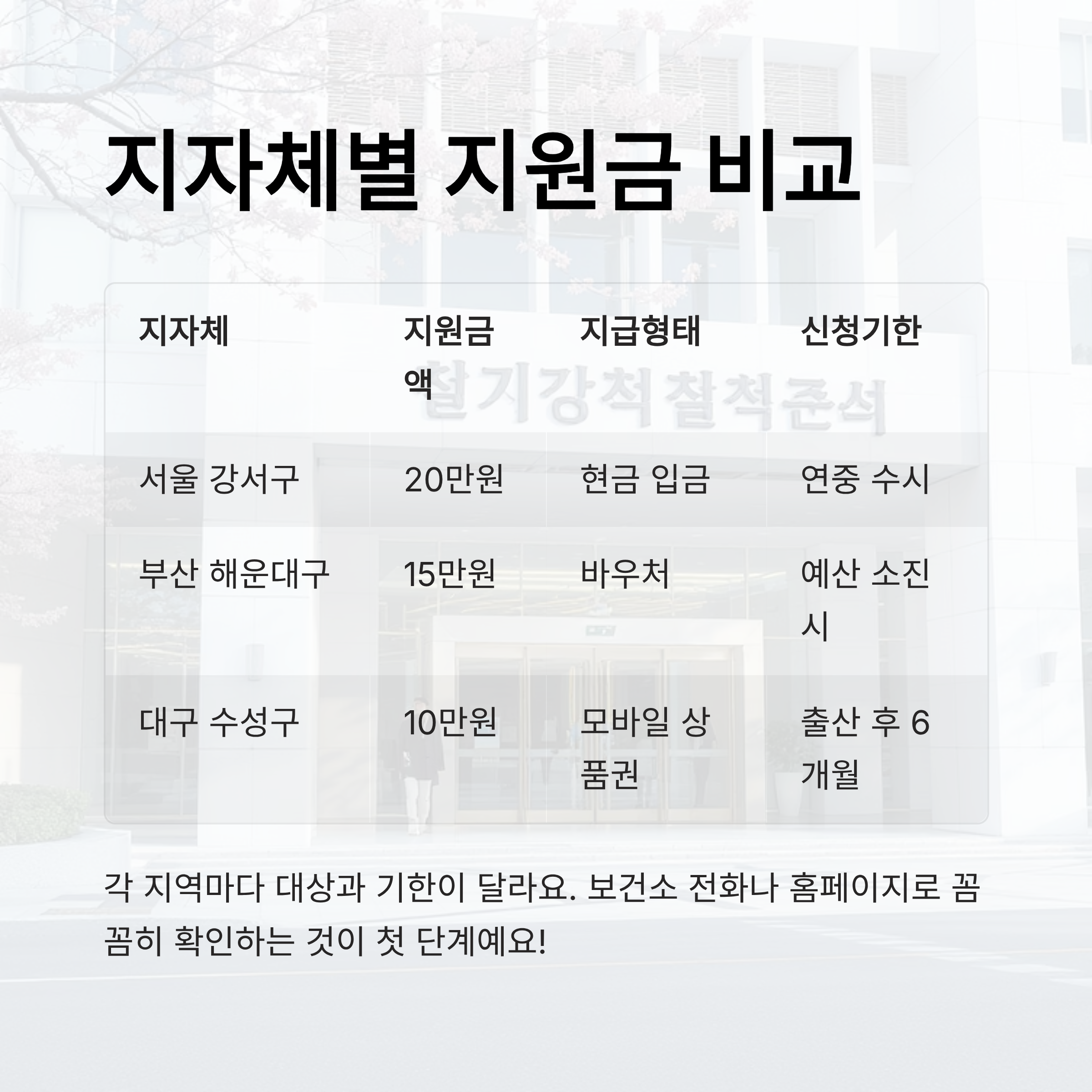 이처럼 각 지자체마다 금액, 대상, 신청기한이 달라서 거주 지역의 정책을 꼼꼼히 확인하는 것이 첫 번째예요. 홈페이지나 보건소 전화문의로 쉽게 알 수 있답니다!