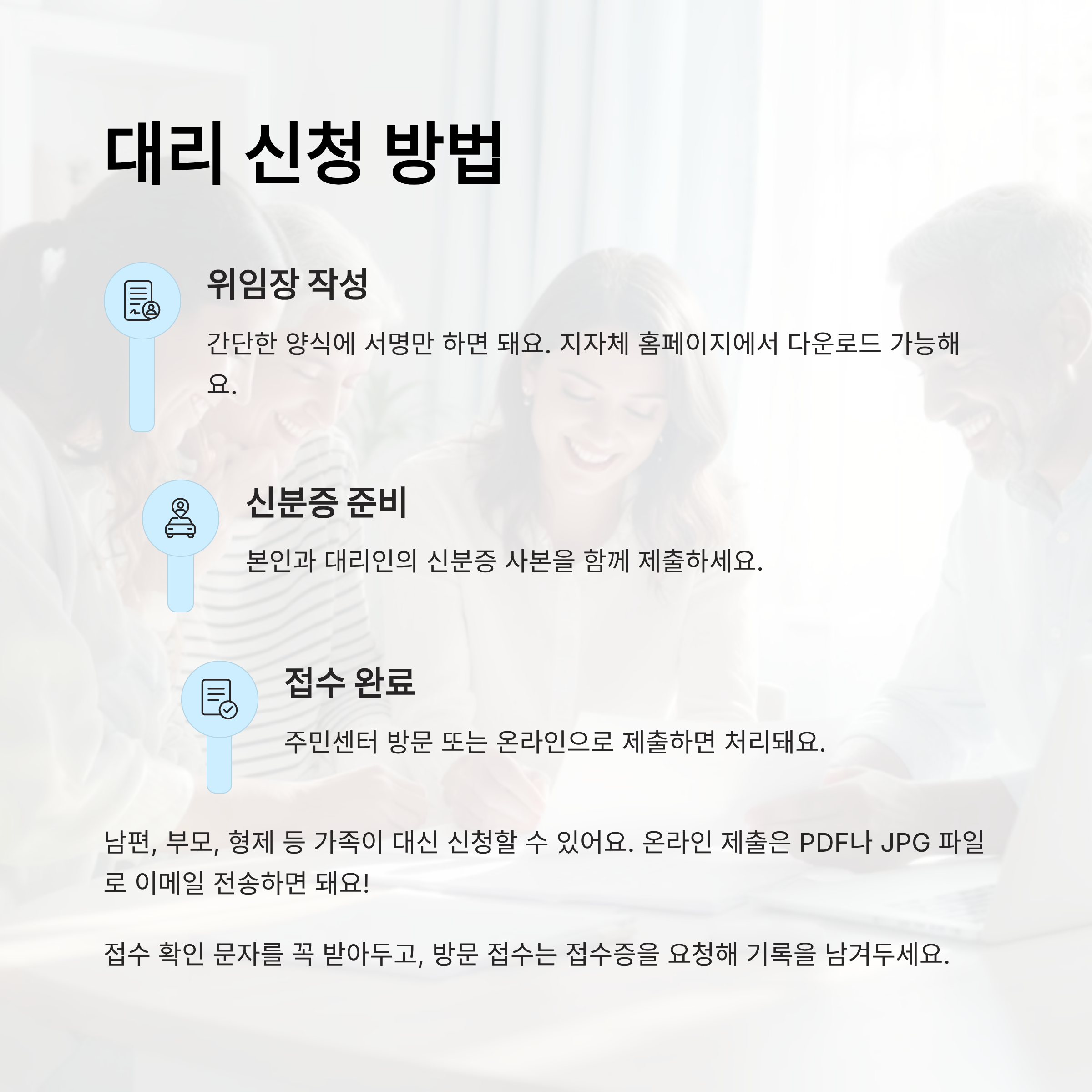 가장 기본적인 조건은 ‘위임장’이에요. 간단한 양식에 서명만 하면 되고, 주민센터에서 바로 작성도 가능해요. 여기에 신청인과 대리인의 신분증 사본을 함께 제출하면 접수가 끝나요. 복잡하지 않아서 정말 시간 절약돼요!