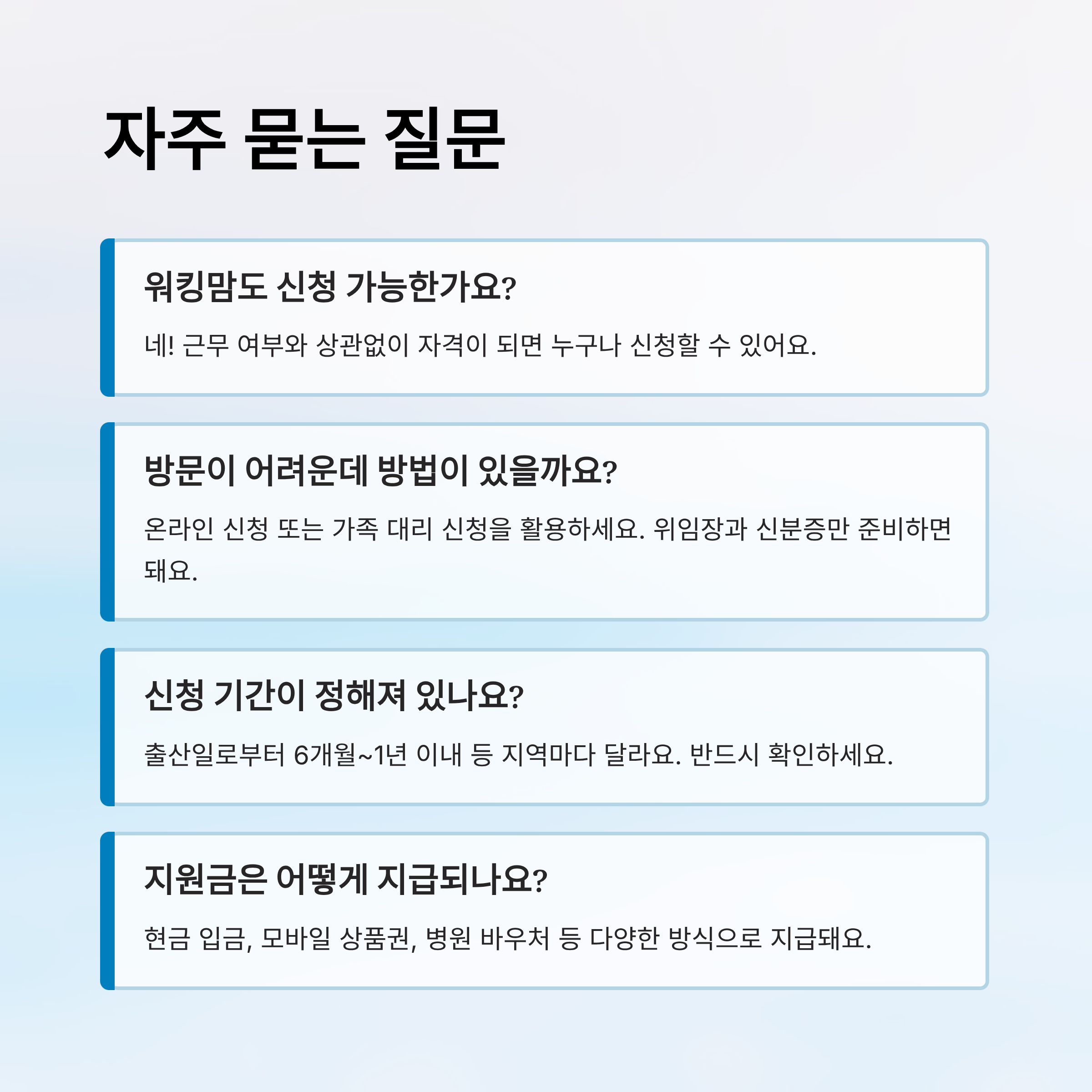이 글에서는 워킹맘의 상황을 고려해 신청 자격부터 방법, 필요한 서류, 대리 신청 팁까지 알차게 정리해드려요. '내가 놓치고 있었던 건 아닐까?' 걱정되는 분들을 위해 자주 묻는 질문(FAQ)도 함께 준비했어요.