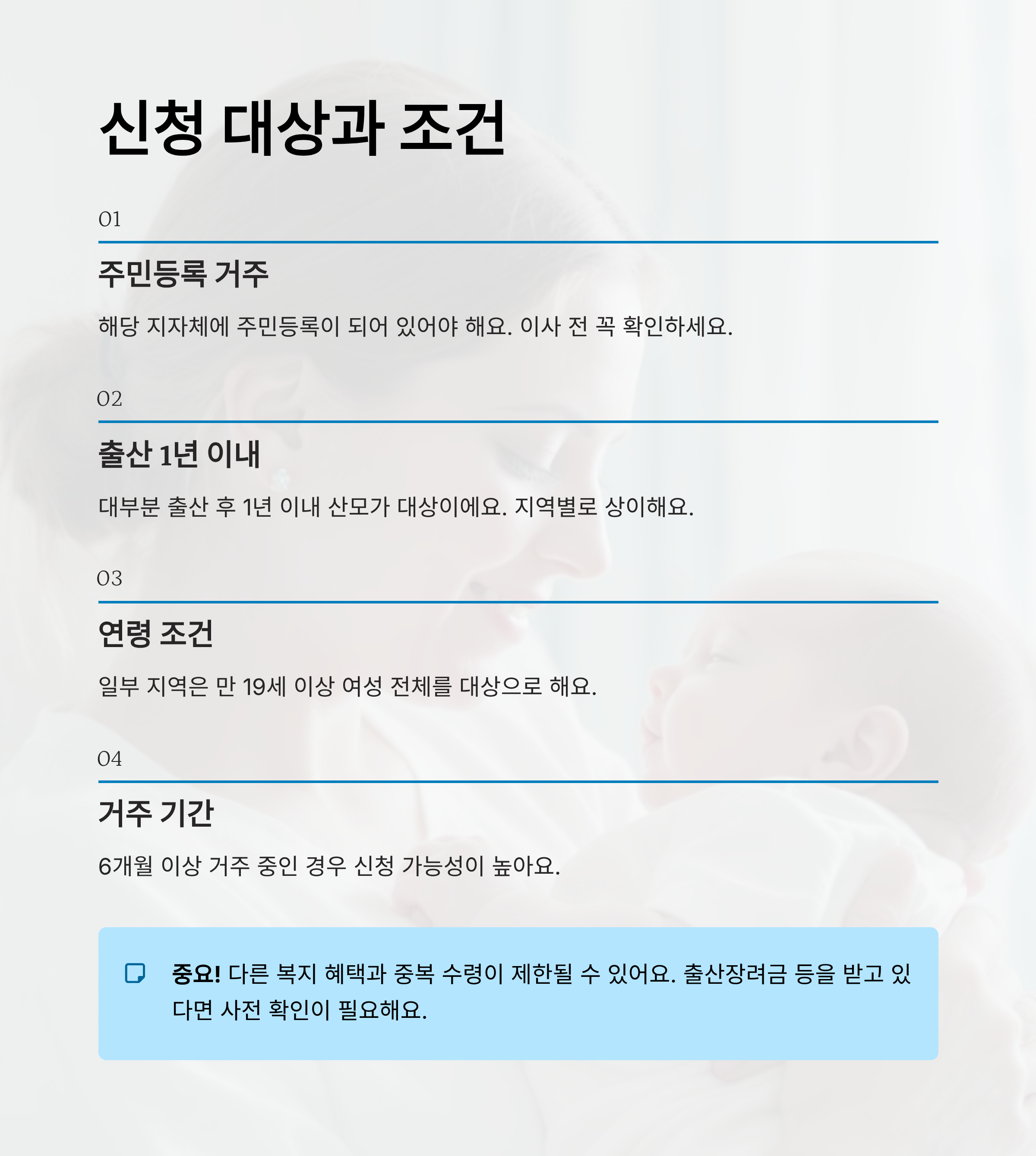 워킹맘들이 가장 궁금해하는 건 "나는 받을 수 있어?"인데요. 일반적으로 다음 조건 중 하나라도 해당된다면 신청 가능성이 높아요. ① 출산 1년 이내 ② 임산부 또는 산후조리 중인 여성 ③ 만 19세 이상 ④ 해당 지역에 6개월 이상 거주 중인 경우 등이에요.