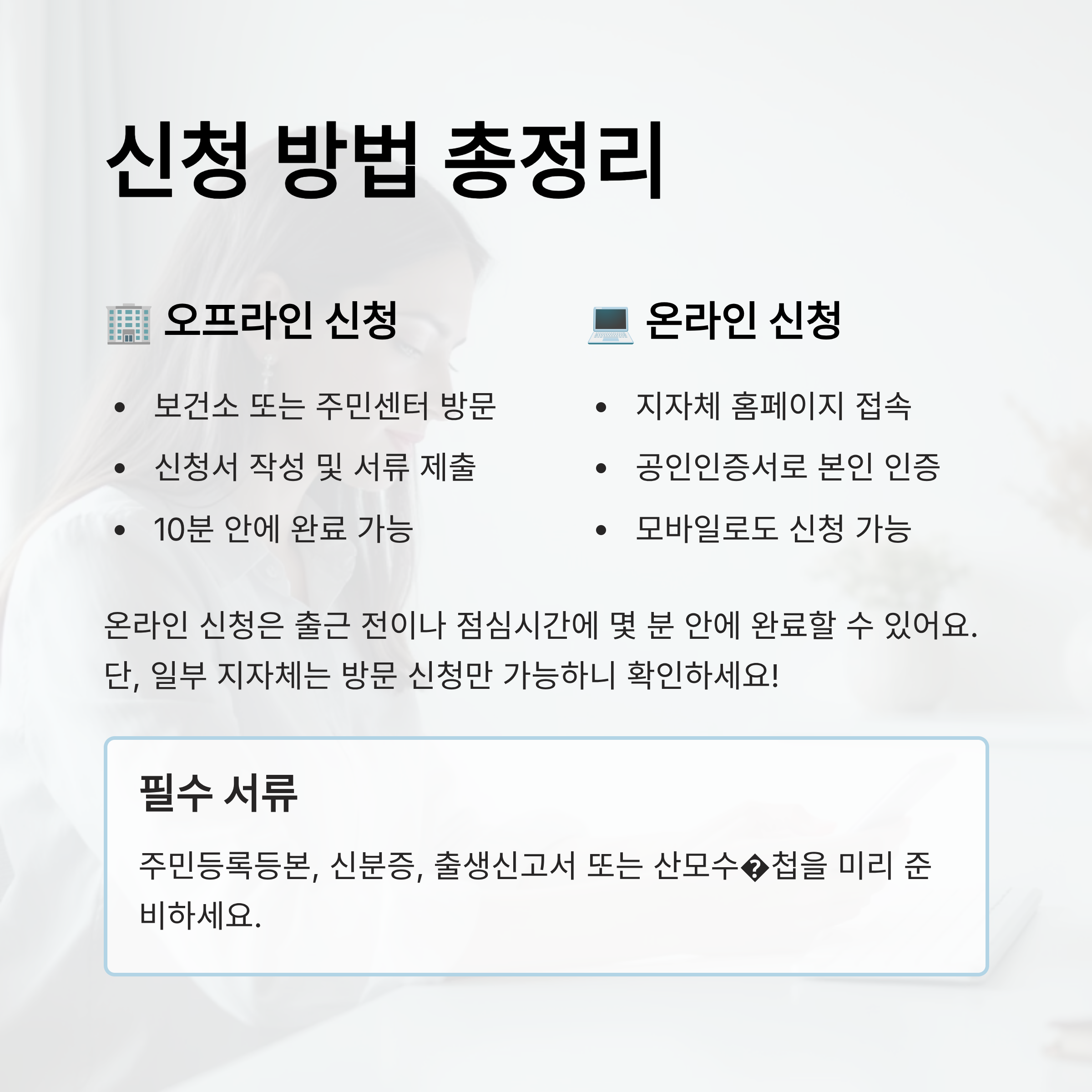 바쁜 워킹맘에게 가장 중요한 건 '신청 시간을 최소화하는 전략'이에요. 업무 시간 외 신청이 가능한 온라인 플랫폼이나, 주말에도 열려 있는 동주민센터를 활용하는 것이 핵심이랍니다. 모바일 신청이 가능한 지역은 꼭 모바일로 해결하는 것이 좋아요.