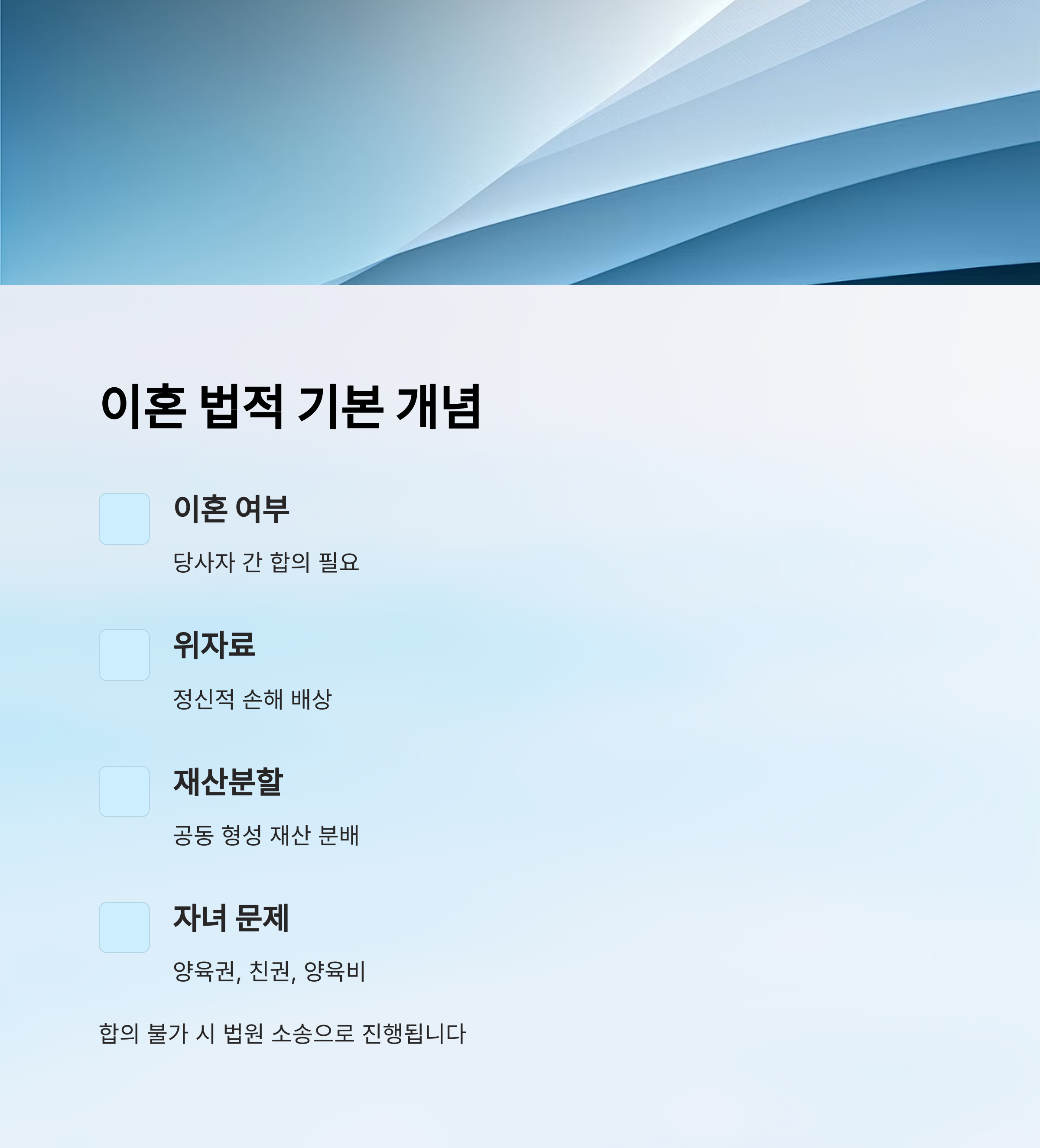| 위자료 | 정신적 고통, 유책성 | 외도, 폭력 등 입증 필요 |