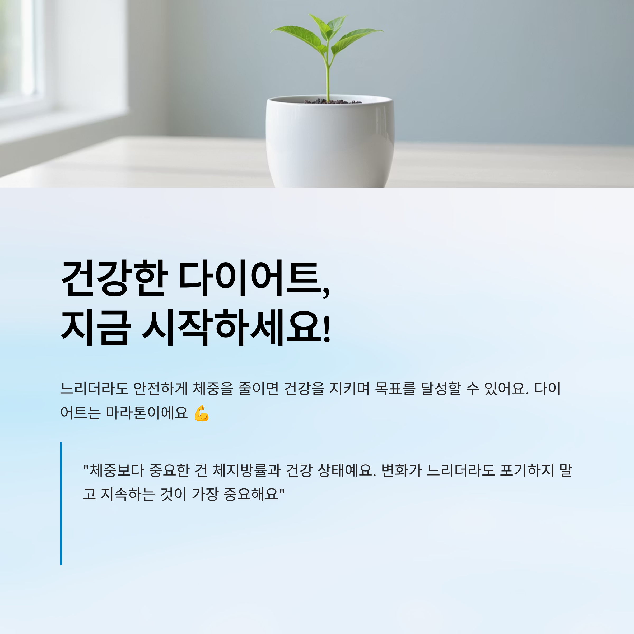 중장년층은 기본적으로 몸의 회복 속도가 느리기 때문에, 변화가 느리다고 조급해하지 않는 것도 중요해요. 느리더라도 안전하게 체중을 줄이면 건강을 지키면서도 목표를 달성할 수 있어요.