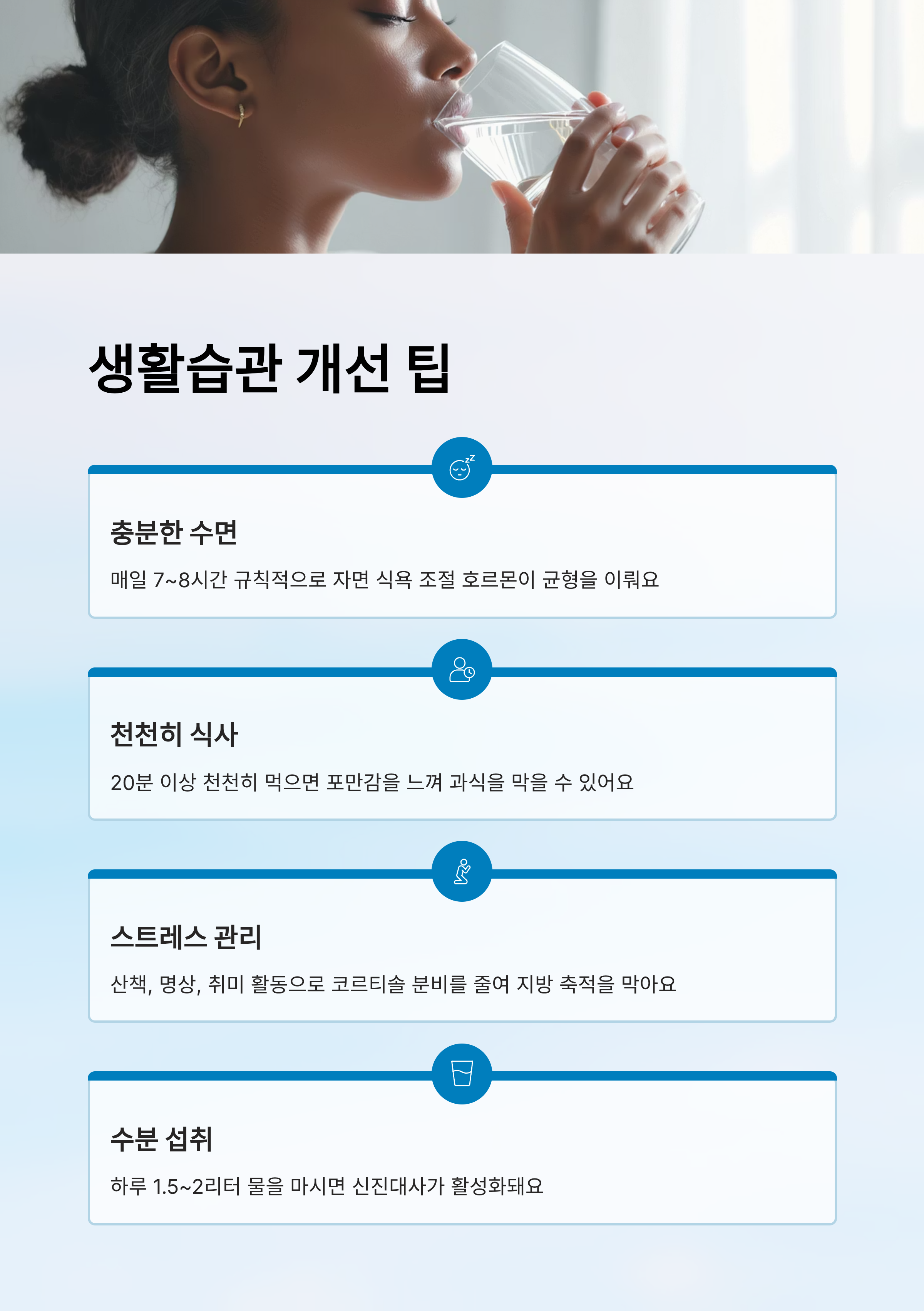 첫 번째 팁은 수면이에요. 수면 시간이 부족하거나 수면의 질이 낮으면 식욕을 조절하는 렙틴과 그렐린 호르몬의 균형이 무너져 과식으로 이어질 수 있어요. 매일 7~8시간 정도 규칙적으로 자는 습관을 들이는 게 좋아요.
