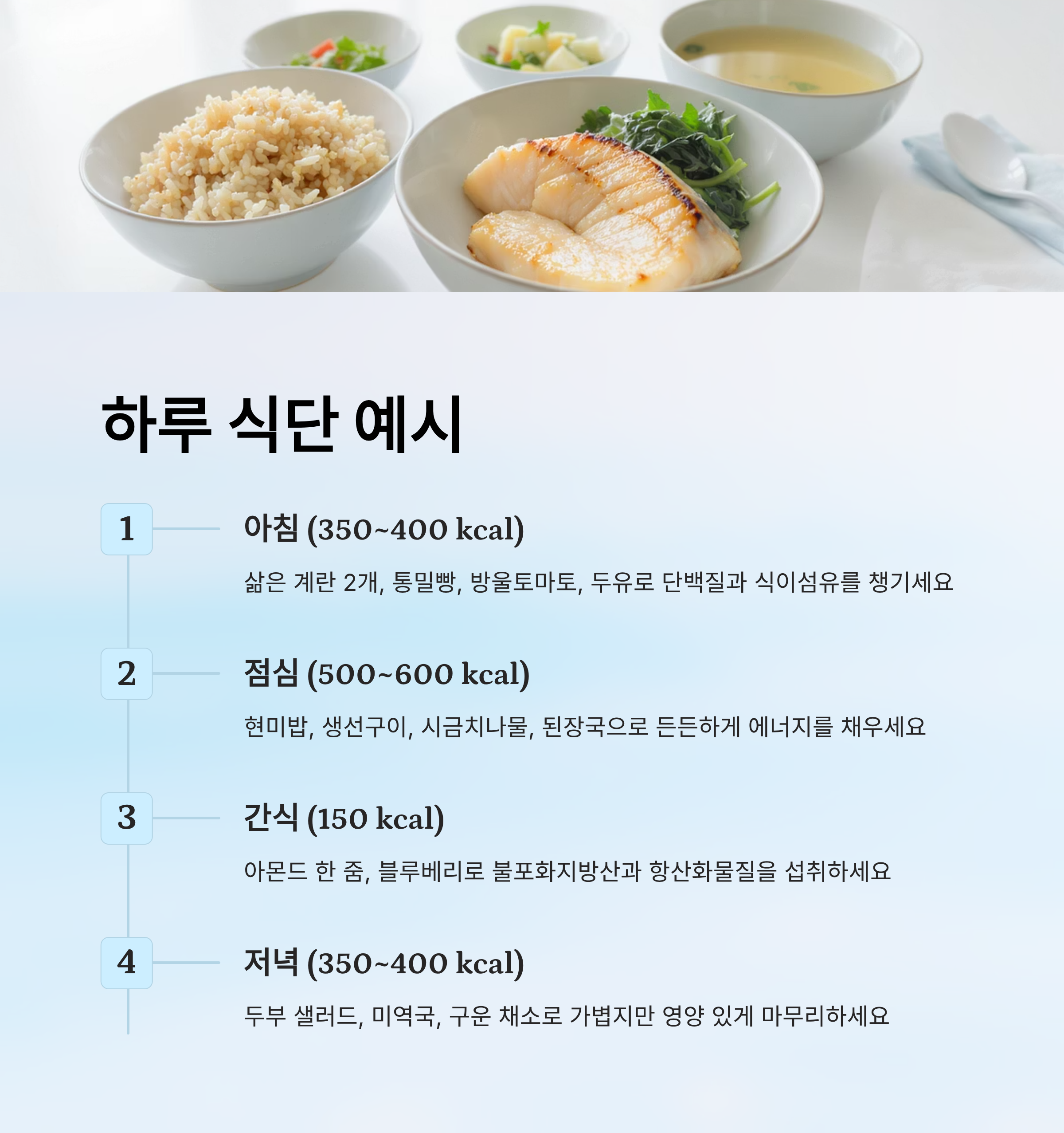 저녁은 가볍게, 하지만 영양은 놓치지 않도록 하는 것이 중요해요. 두부 샐러드, 미역국, 브로콜리, 구운 채소 등을 활용해 포만감은 주되 칼로리는 낮게 유지하는 게 좋아요. 자기 전엔 간식 대신 따뜻한 허브차 한 잔이 효과적이에요.