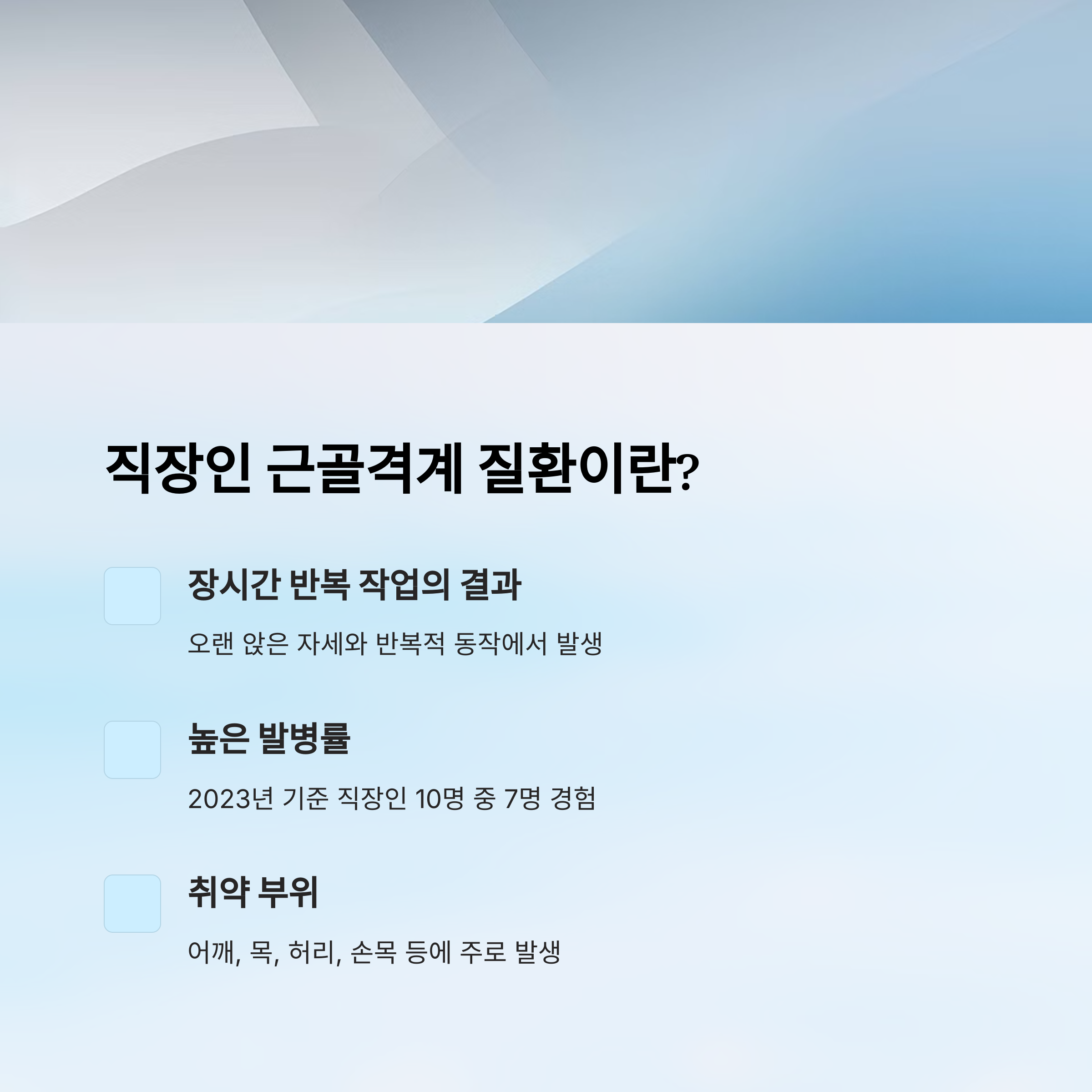 근골격계 질환은 뼈, 근육, 인대, 관절 등에 발생하는 통증이나 기능장애를 말해요. 특히 반복적인 동작, 부적절한 자세, 장시간 동일 자세로 인한 피로 누적으로 인해 발생하기 쉬운 질환들이죠.