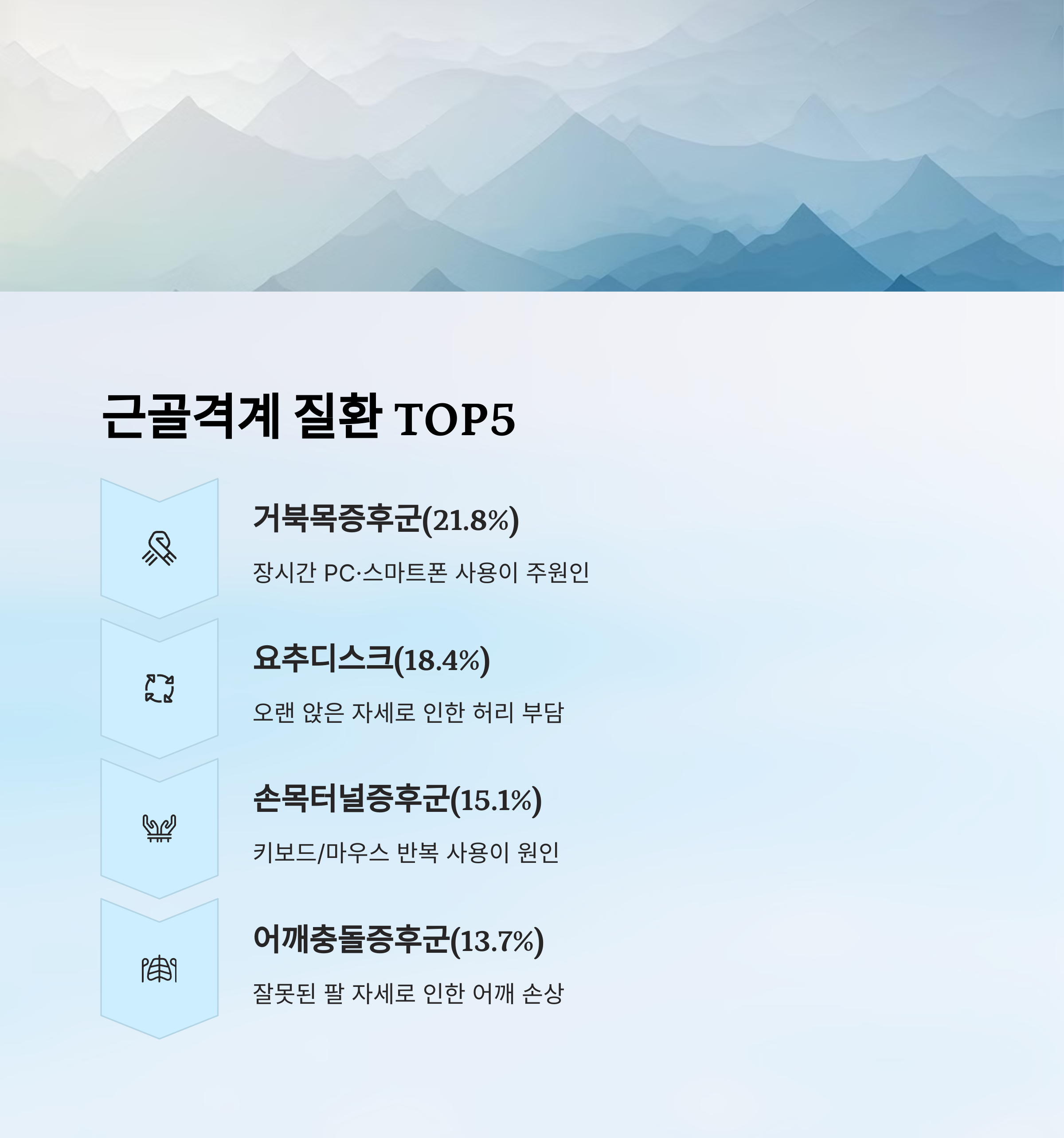 특히 하루 8시간 이상을 앉아 있는 경우, 자세 불균형이 누적되어 척추 디스크나 손목터널증후군까지 이어지는 경우도 있어요.