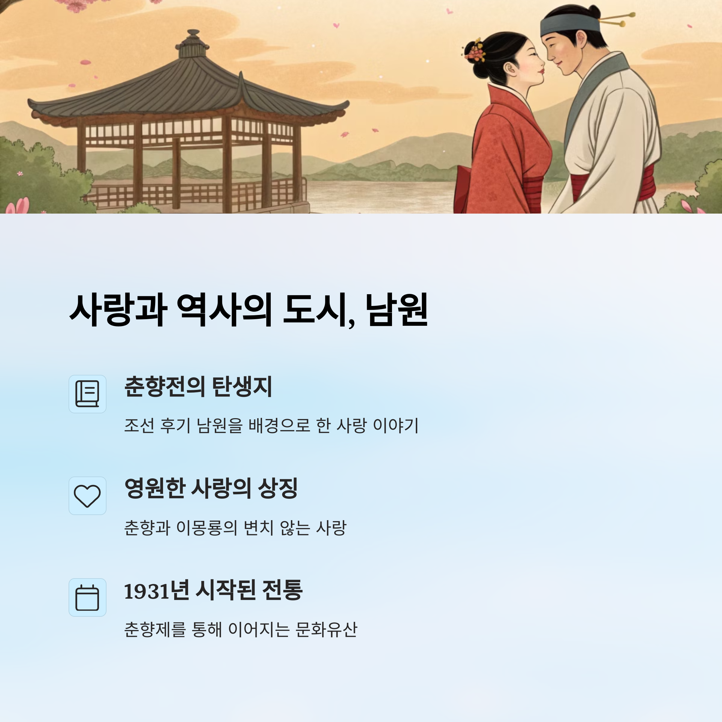 전라북도 남원은 고전 소설 춘향전의 무대이자 한국의 대표적인 낭만 도시예요. 조선시대 사랑 이야기의 대표격인 춘향과 이몽룡의 애틋한 로맨스가 깃든 이곳은, 과거와 현재가 아름답게 어우러진 여행지로 많은 사람들의 사랑을 받고 있어요.
