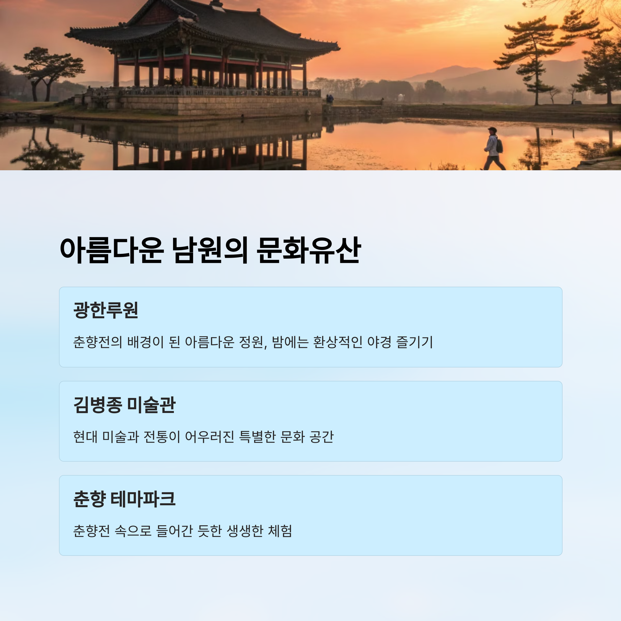 문학, 역사, 사랑의 정서가 조화롭게 얽혀 있는 이 도시를 거닐다 보면, 그저 관광을 하는 게 아니라 한 편의 아름다운 이야기를 직접 걷는 기분이 들어요. 그게 바로 남원의 가장 큰 매력인 것 같아요. ✨