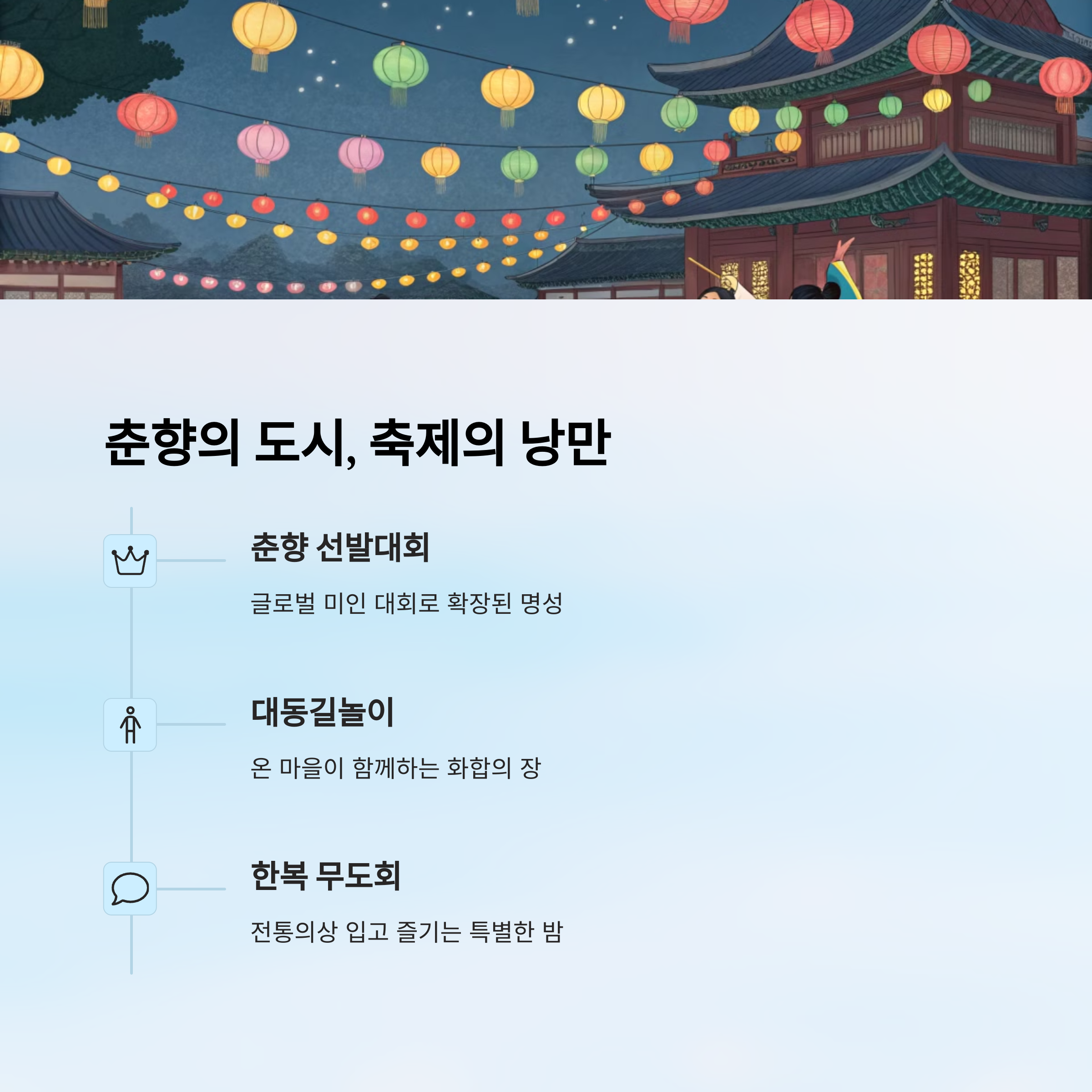 남원의 고즈넉한 문화유산을 걸으며, 춘향전의 감성과 조선의 풍류를 함께 느낄 수 있어요. 다음으로는 남원의 가장 화려한 순간, 춘향제와 다양한 축제들을 소개할게요! 🎊