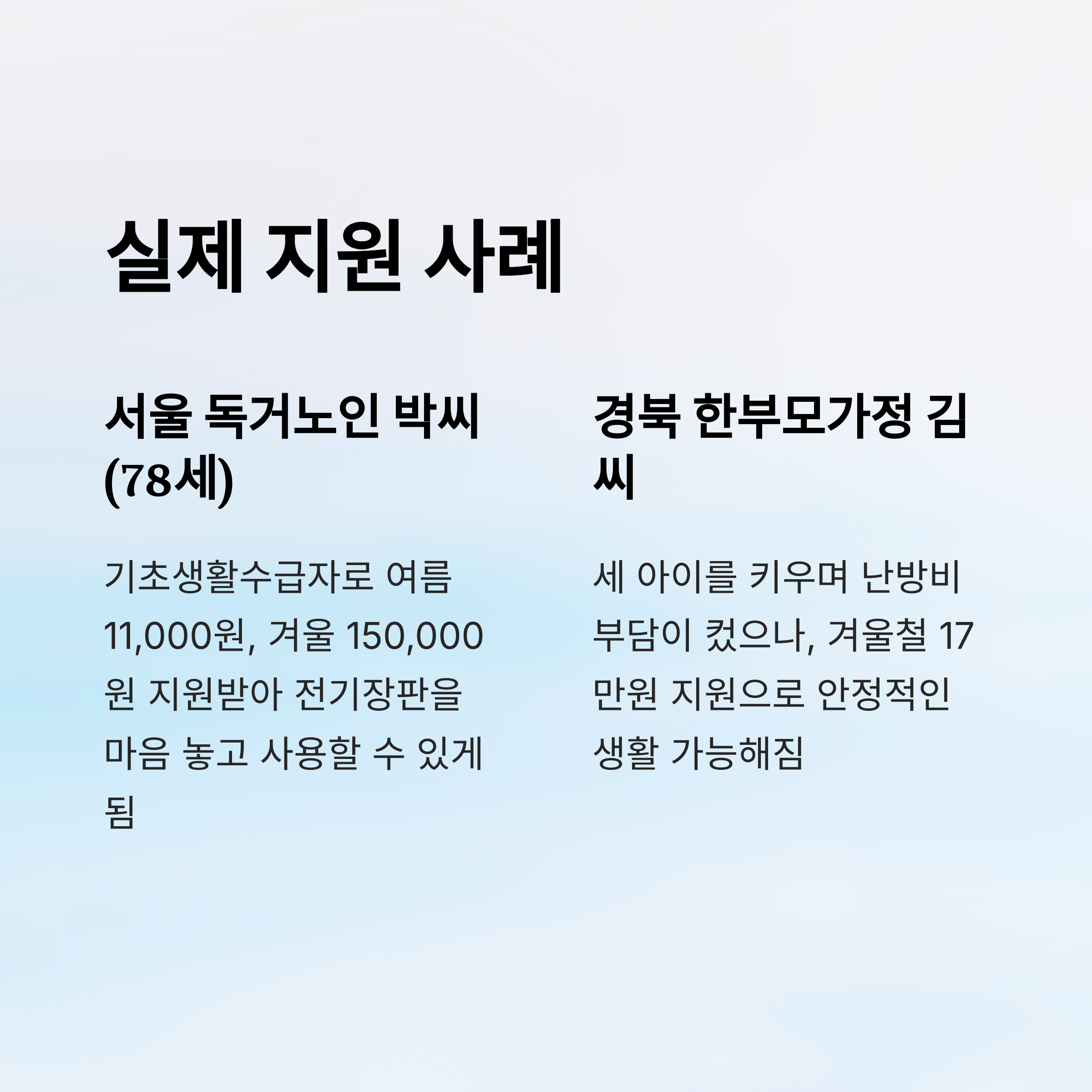 | 박○○ | 독거노인 | 서울 | 161,000원 | 전기장판 자유 사용 |