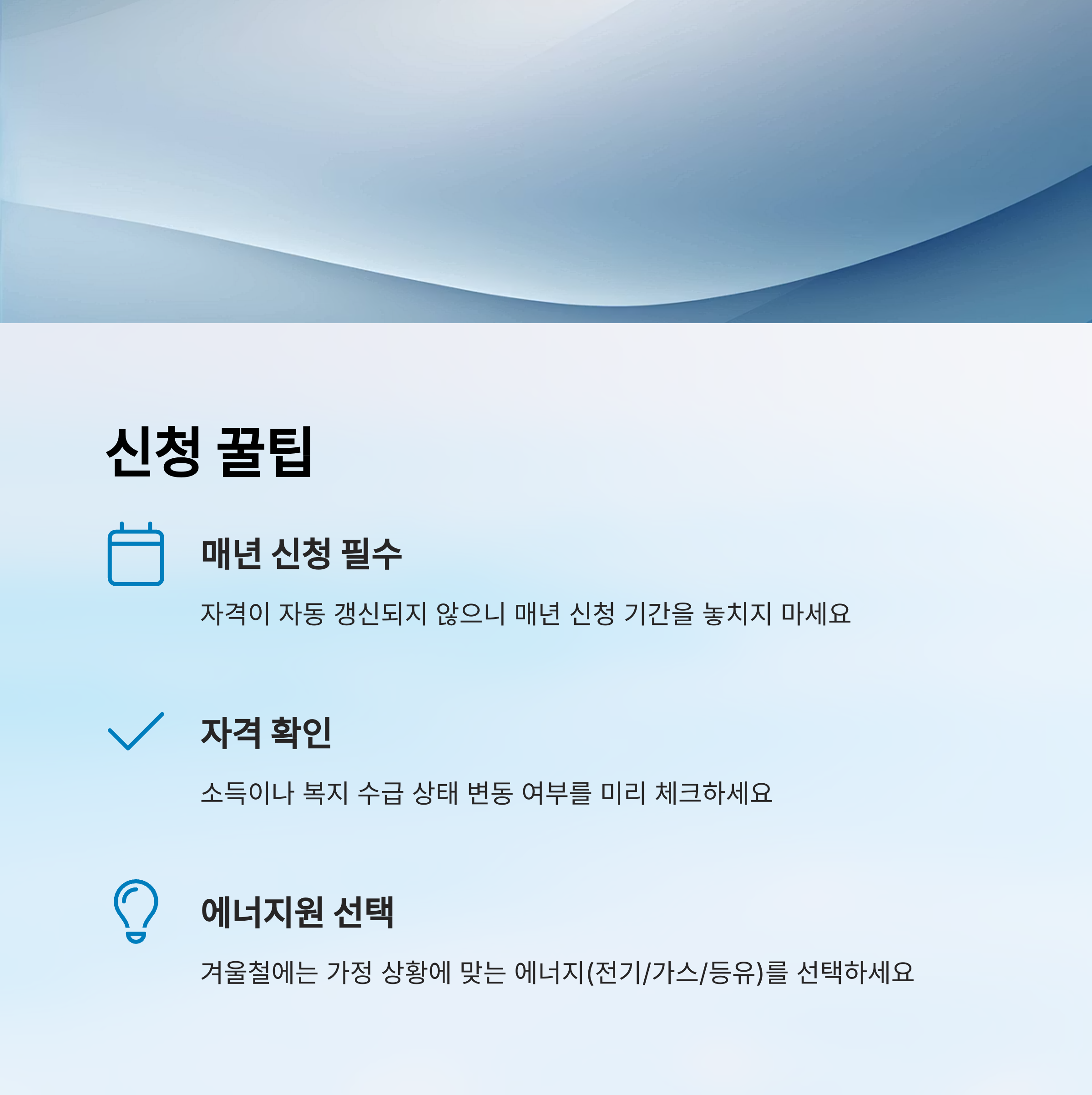 마지막으로, 주변에 정보가 부족한 어르신이나 지인에게 꼭 알려주면 좋아요. 생각보다 많은 분들이 이 제도를 몰라서 혜택을 못 받는 경우가 많거든요. 우리 모두 같이 따뜻한 겨울, 시원한 여름을 만들어봐요! 😊