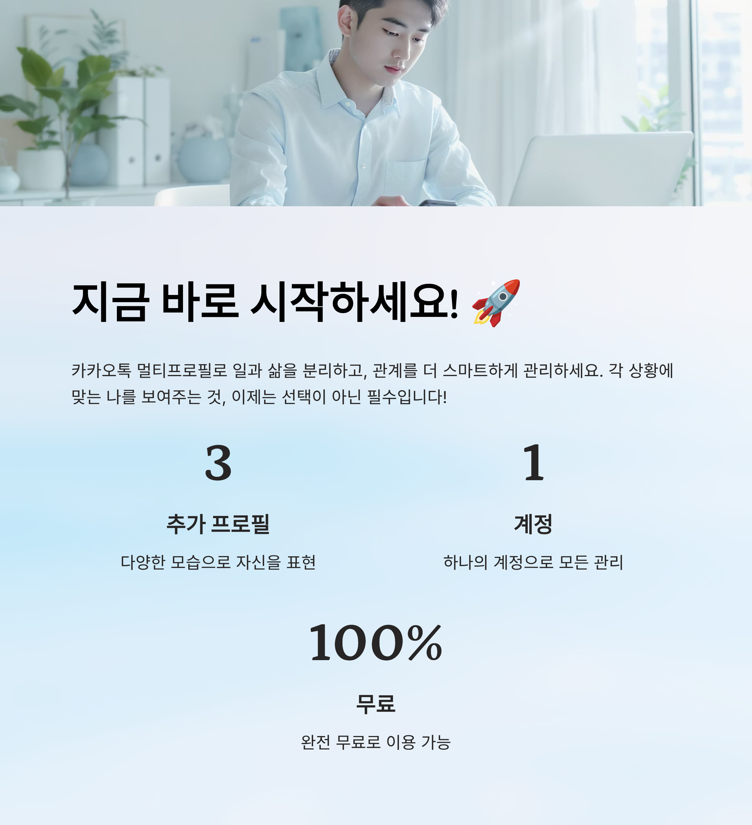 멀티프로필은 상대방에게 보여지는 나의 정보를 자유롭게 컨트롤할 수 있게 해주죠. 예를 들어 회사 사람들에게는 정중한 이미지를, 친구들에게는 유쾌하고 자유로운 모습을 보여줄 수 있답니다. 🧑💼👨🎤