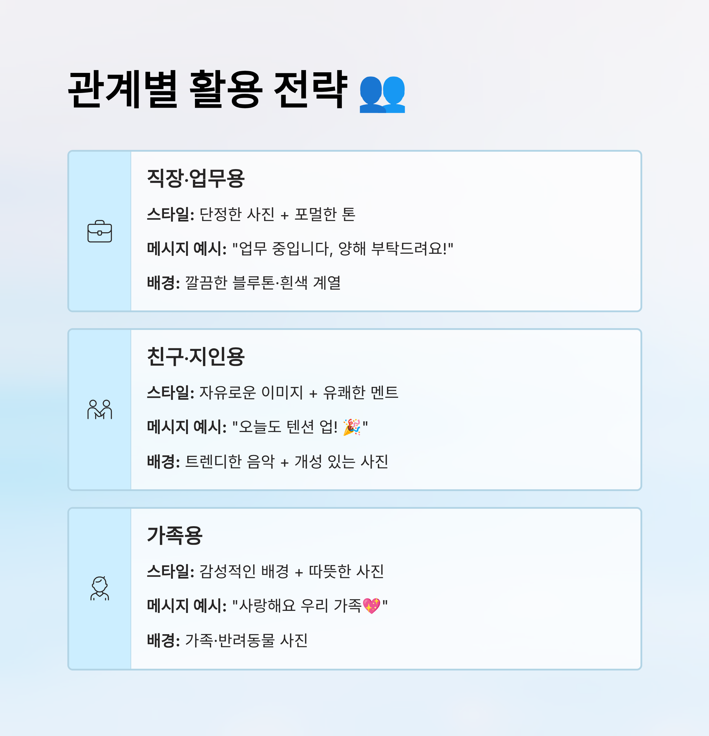 | 관계 유형 | 추천 스타일 | 상태 메시지 예시 |