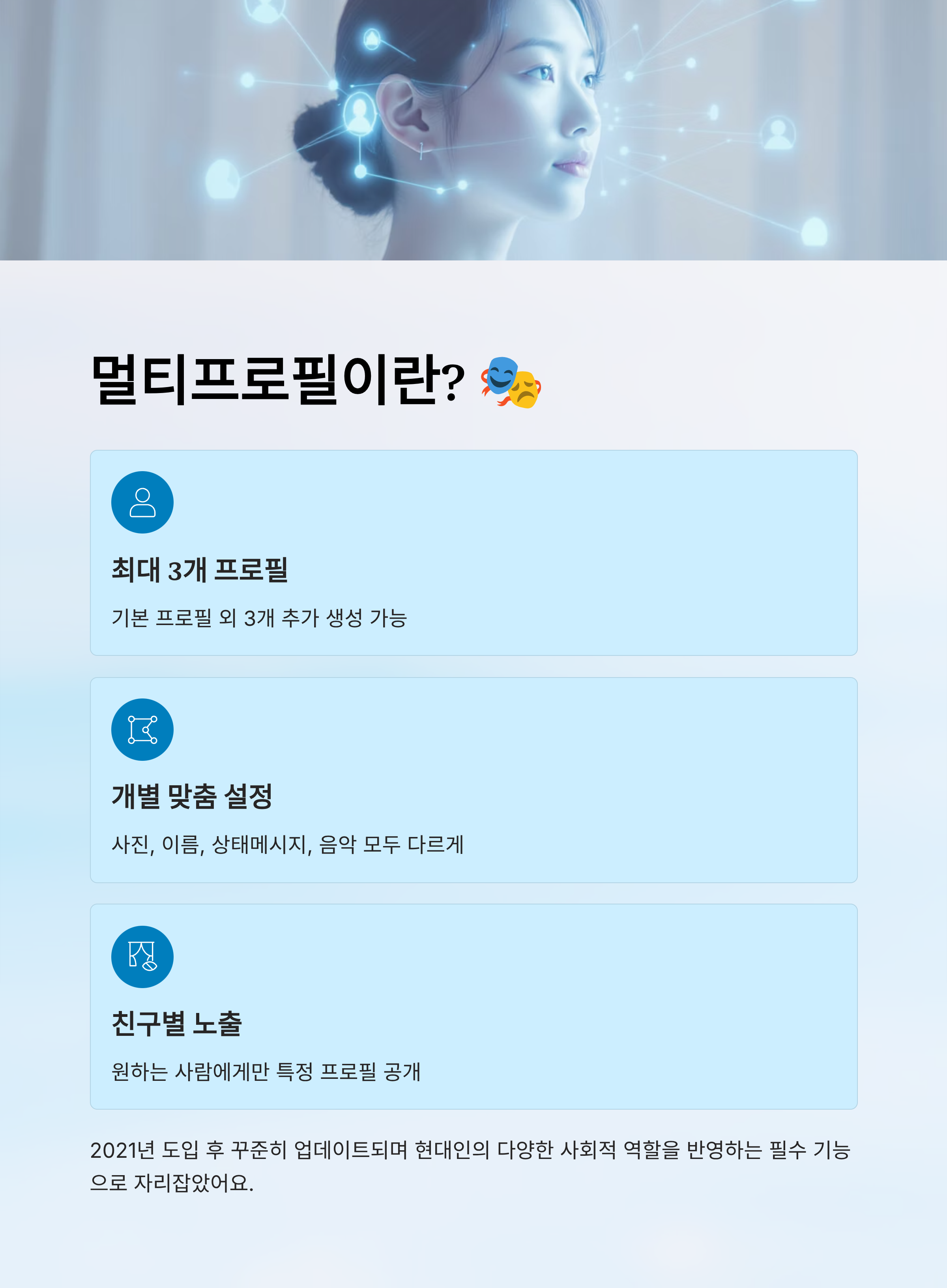 2021년에 처음 도입된 이 기능은 2025년 현재에도 꾸준히 업데이트되며 사용자 편의를 고려하고 있어요. 특히 최근에는 프로필별 상태 음악, 배경 꾸미기 기능도 추가되어 더욱 다채롭게 사용할 수 있게 되었어요.