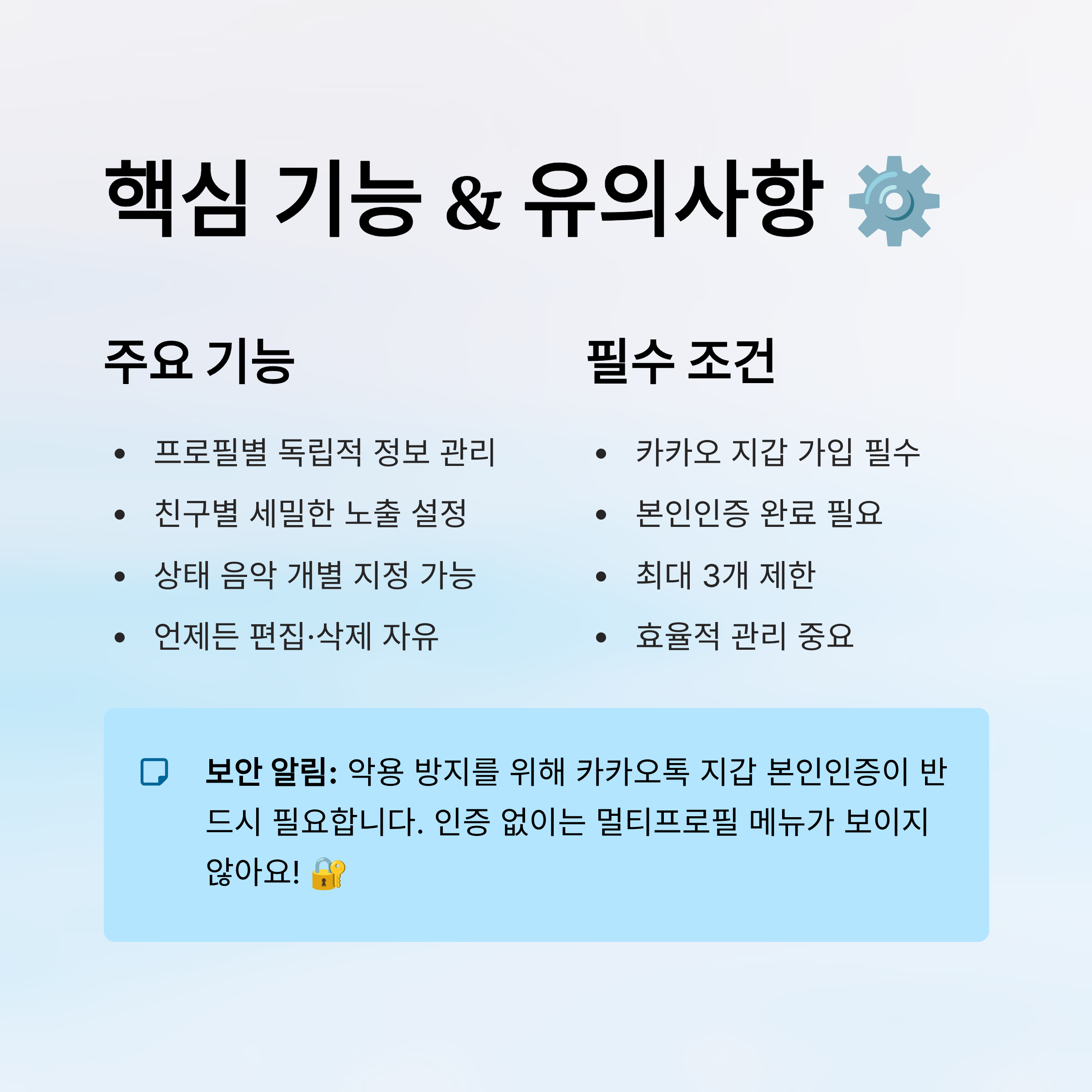 하지만 유의할 점도 있어요. 멀티프로필 기능을 사용하려면 **카카오톡 지갑에 가입하고 본인인증을 완료**해야 해요. 이는 악용을 방지하기 위한 보안 절차이고, 사용자 식별을 위한 필수 과정이에요. 인증이 되지 않으면 멀티프로필 메뉴가 보이지 않을 수도 있답니다. 🔐