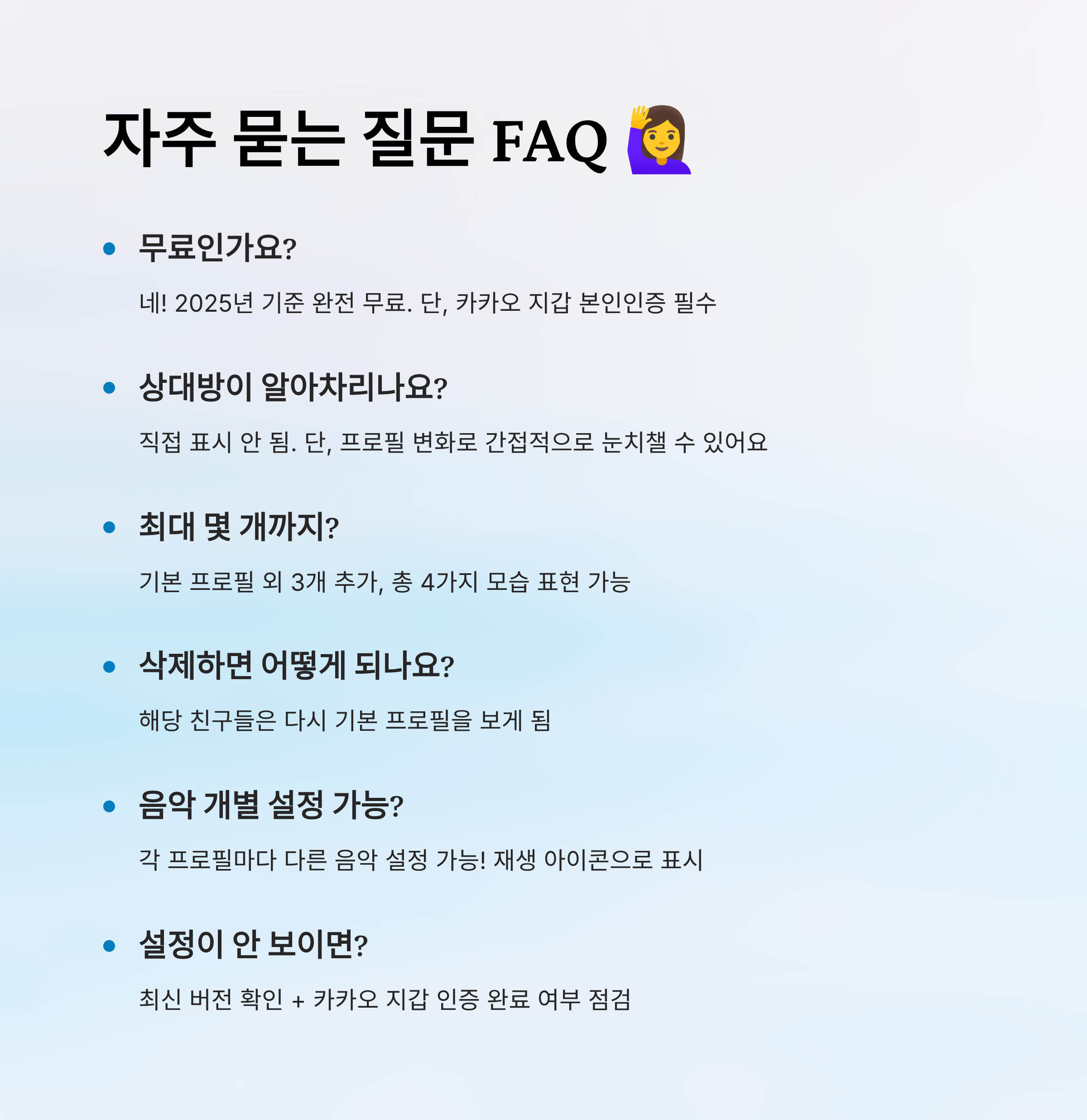 A5. 물론이에요! 각 멀티프로필별로 다른 음악을 설정할 수 있어요. 음악은 프로필에 재생 아이콘으로 나타나며, 상대방이 누르면 들을 수 있어요.