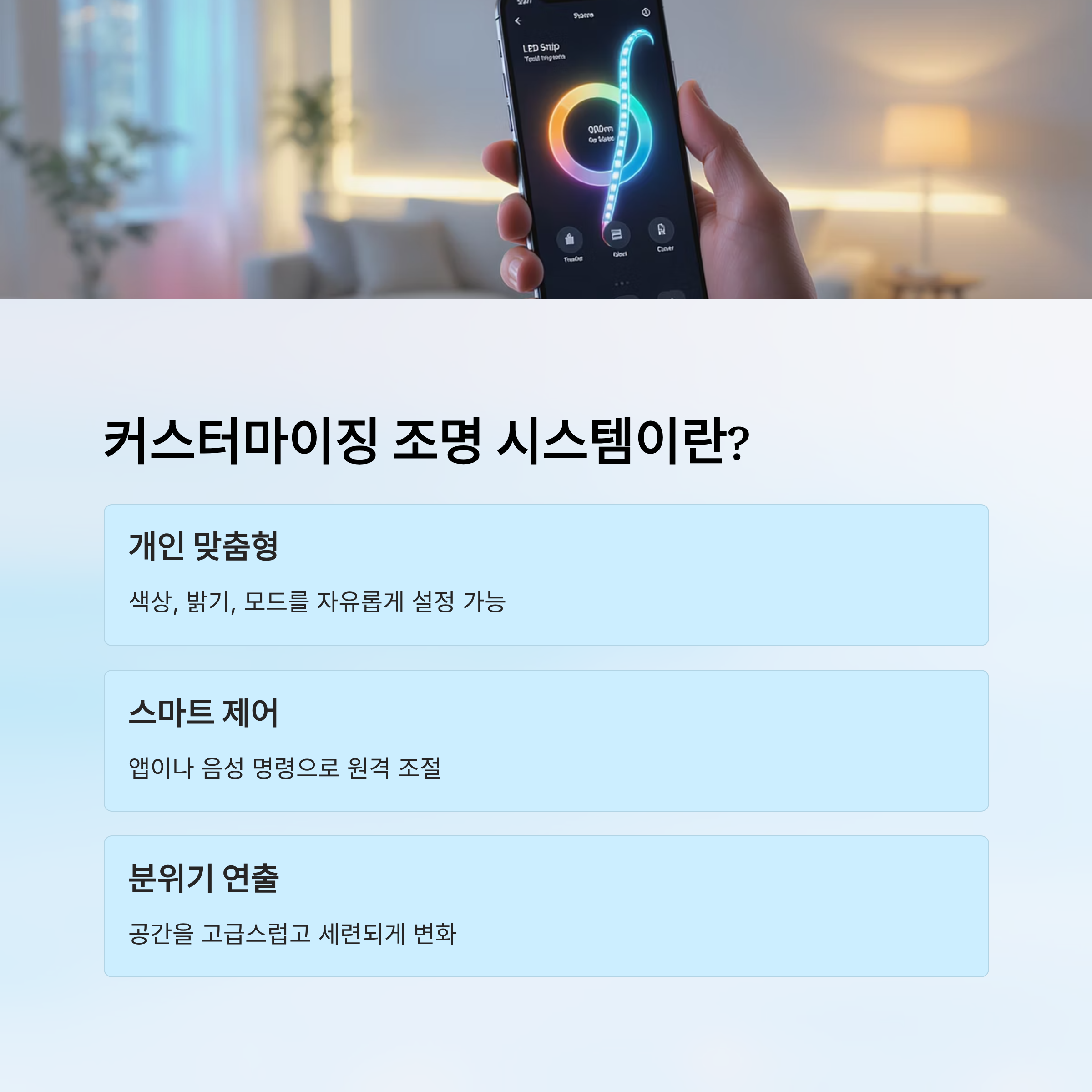 | 컨트롤러 | 조명 색상, 밝기 조절 | 앱/리모컨 연동 | 스마트홈, 개인방 |
