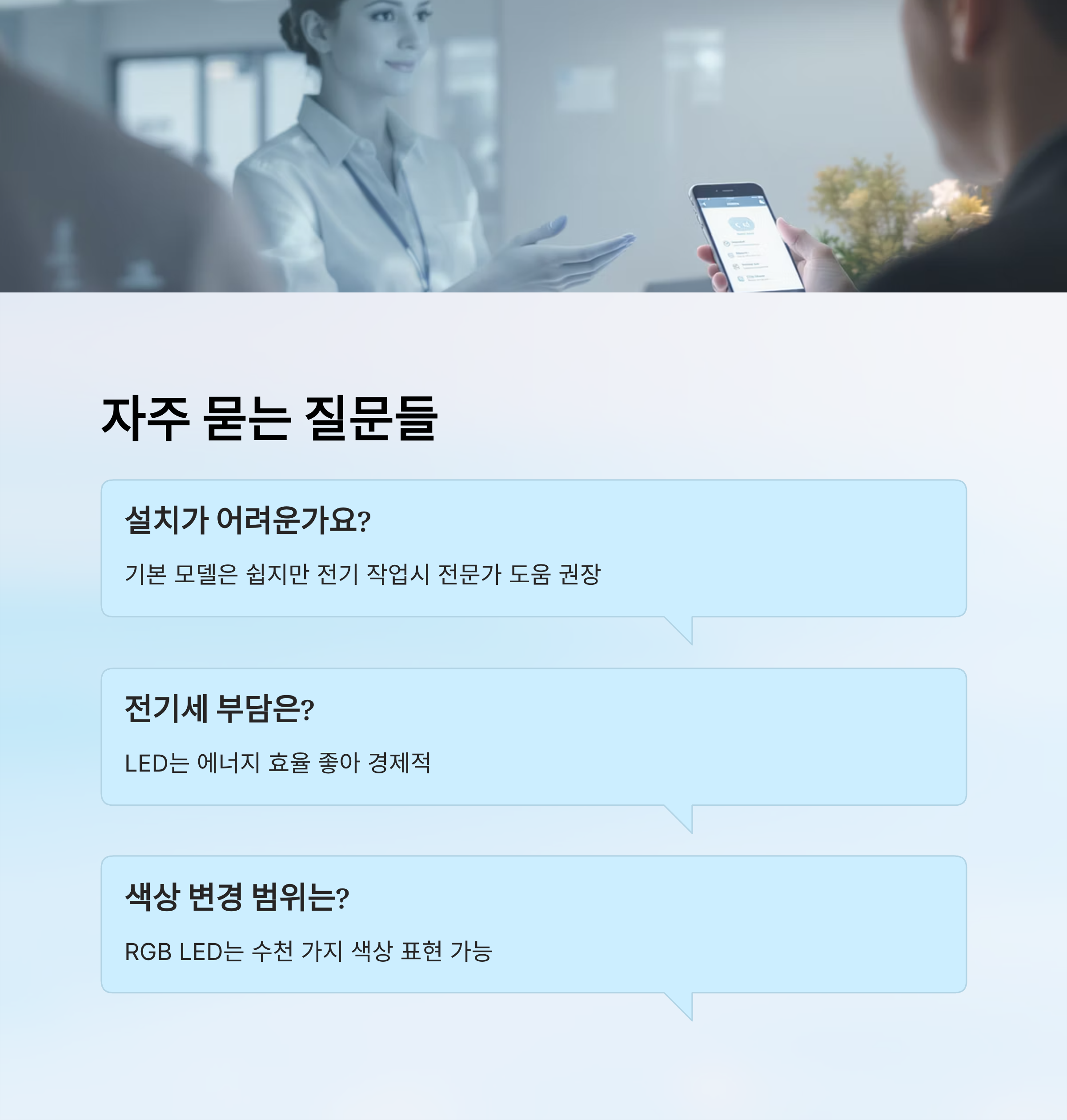 A6. LED 수명이 길고 관리가 쉬워 별도의 유지보수는 적지만, 앱 업데이트와 제품 점검을 주기적으로 해주는 게 좋아요.