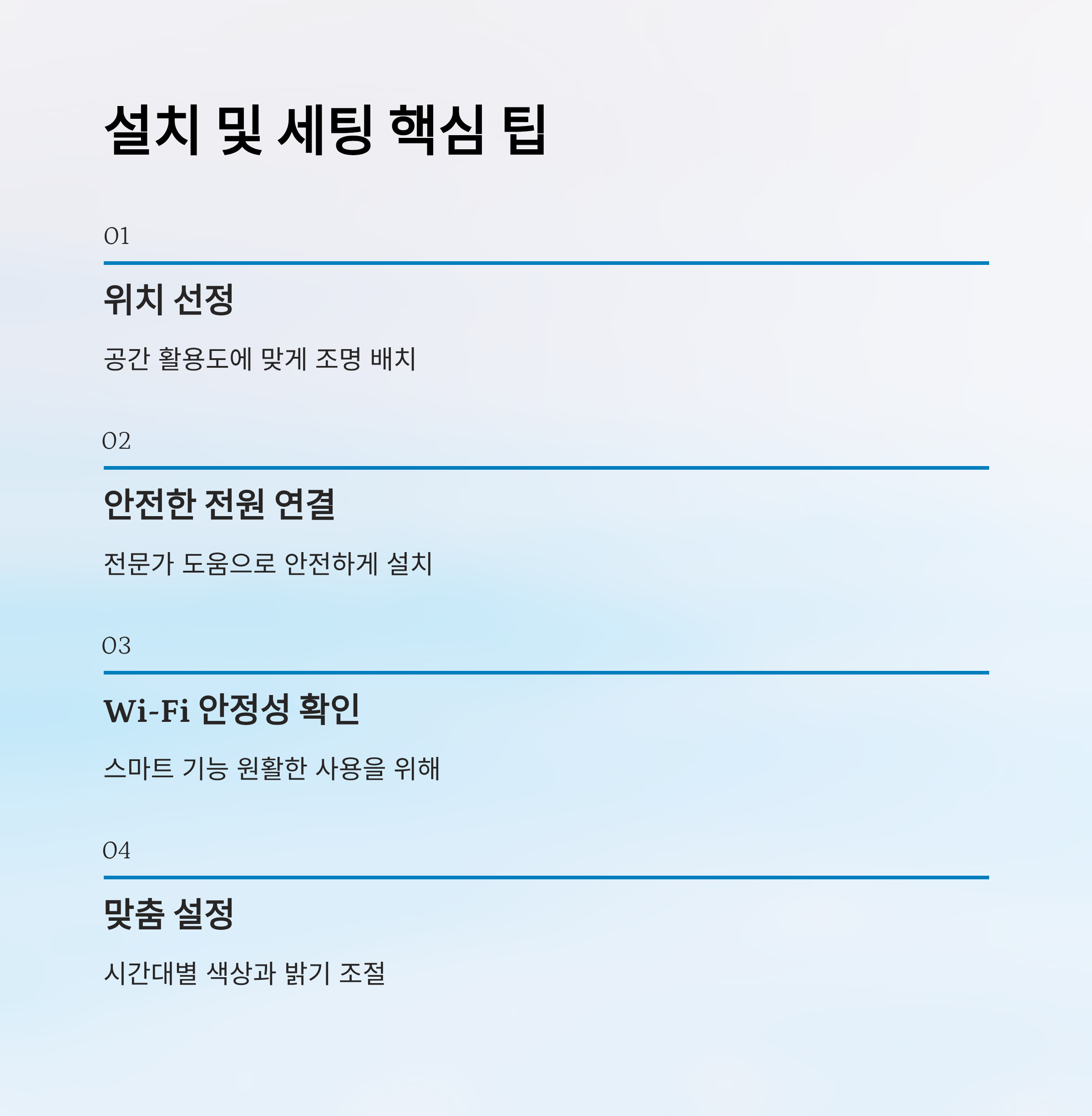 | 앱/음성 연동 | 편리한 조명 제어 지원 | 중간 | 초기 세팅 꼼꼼히 |