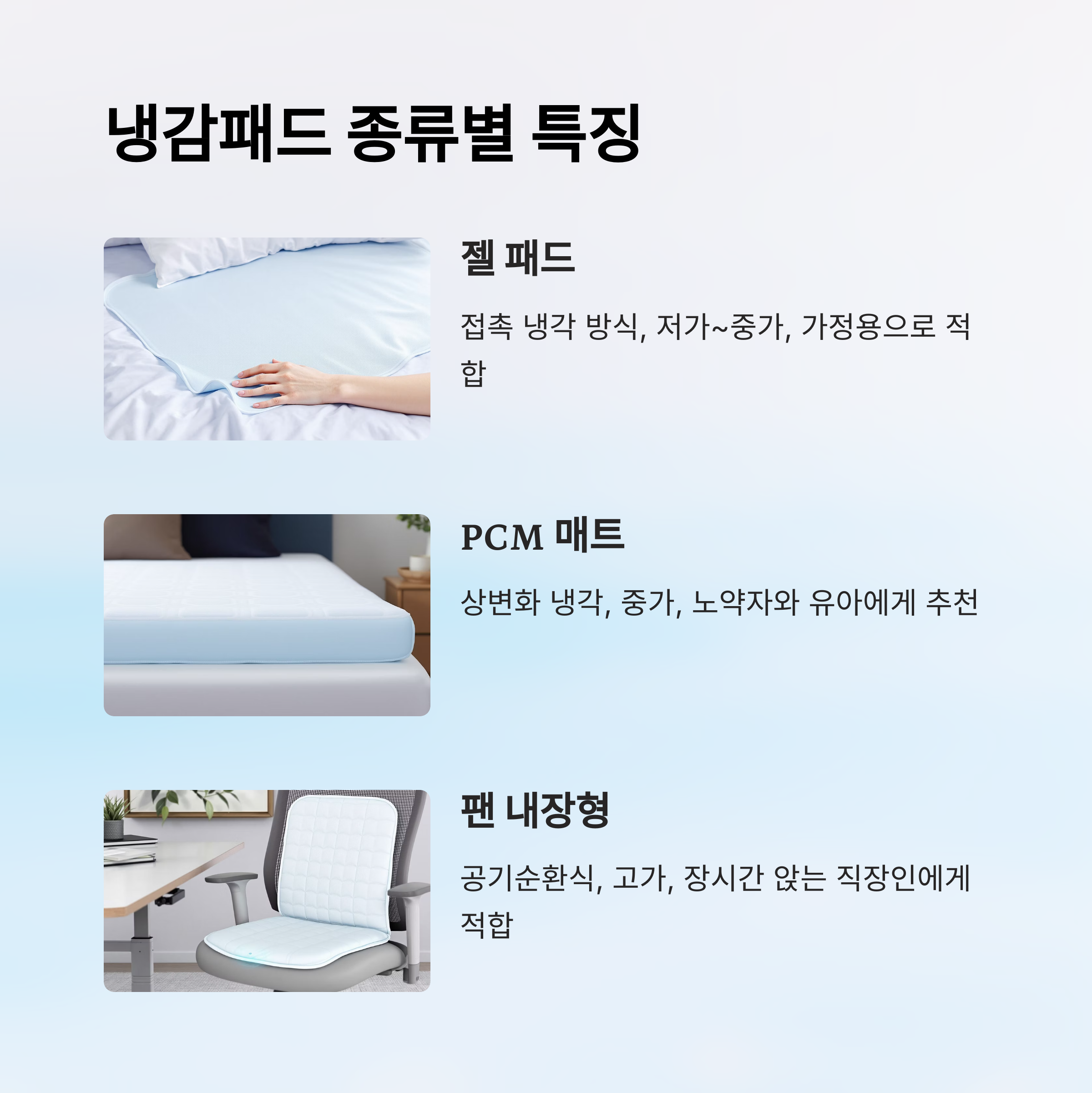 | PCM 매트 | 상변화 냉각 | 침실, 사무실 | 중가 | 노약자, 유아 |