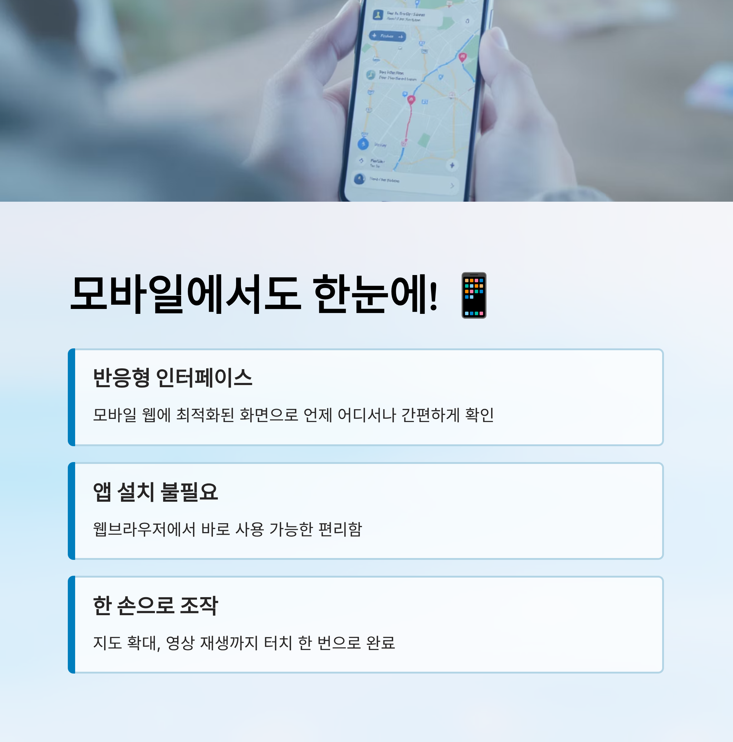 요즘은 대부분 스마트폰으로 정보를 확인하죠? 이 CCTV 서비스는 모바일 웹에 최적화되어 있어서 폰 하나로 언제 어디서든 쉽게 확인할 수 있어요. 데스크톱처럼 무거운 화면 없이, 반응형 인터페이스로 최적화되어 있어요.
