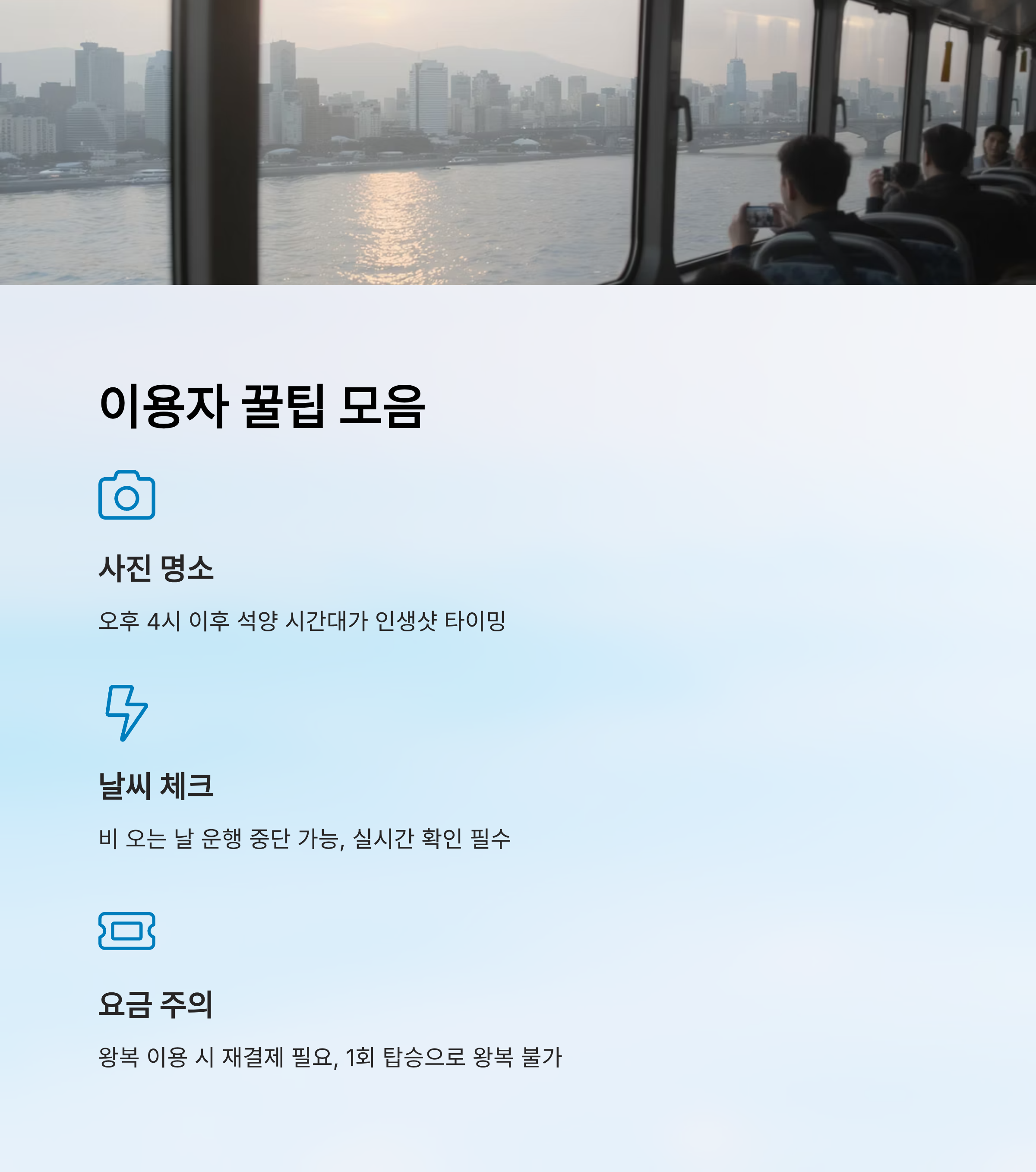 한강버스를 똑똑하게 즐기려면, 소소하지만 중요한 팁들을 알고 가는 게 좋아요. 특히 날씨, 인파, 위치 특성까지 고려해서 준비하면 더 알찬 시간이 될 수 있답니다!