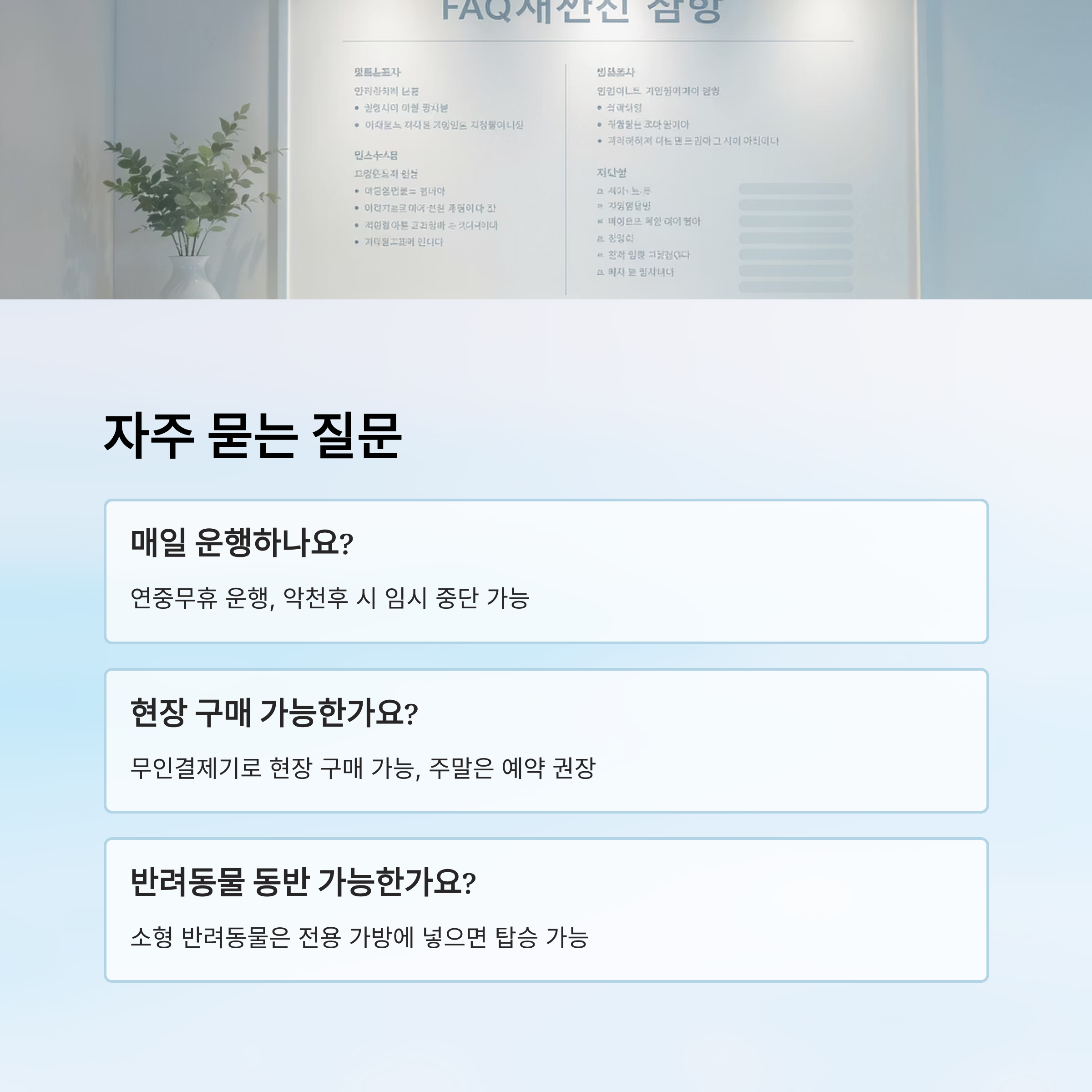A2. 네! 모바일 예약 없이도 정류장 내 무인결제기를 통해 티켓을 살 수 있어요. 하지만 주말에는 사전 예약이 훨씬 유리해요.