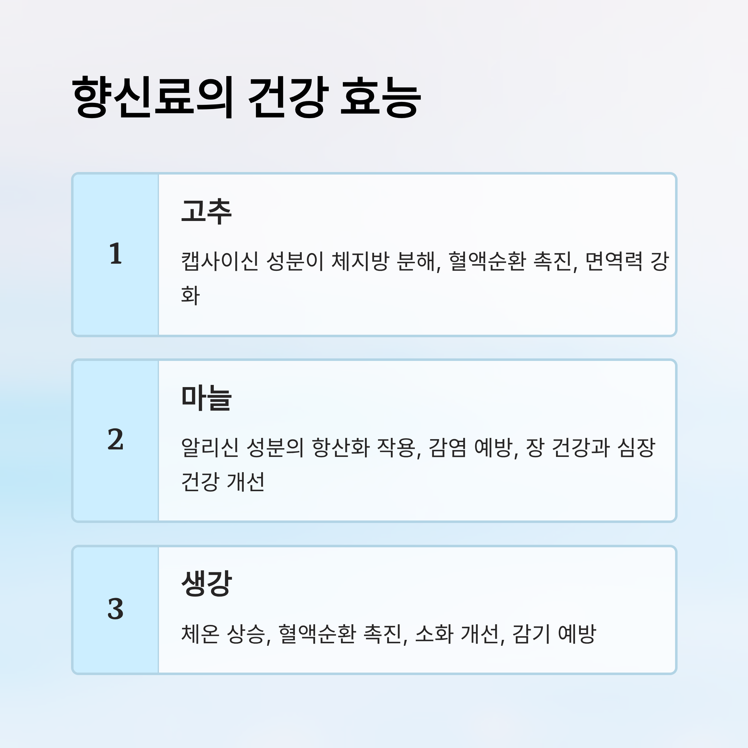 | 마늘 | 강함 | 따뜻함 | 면역력 증가 | 김치, 볶음요리 |