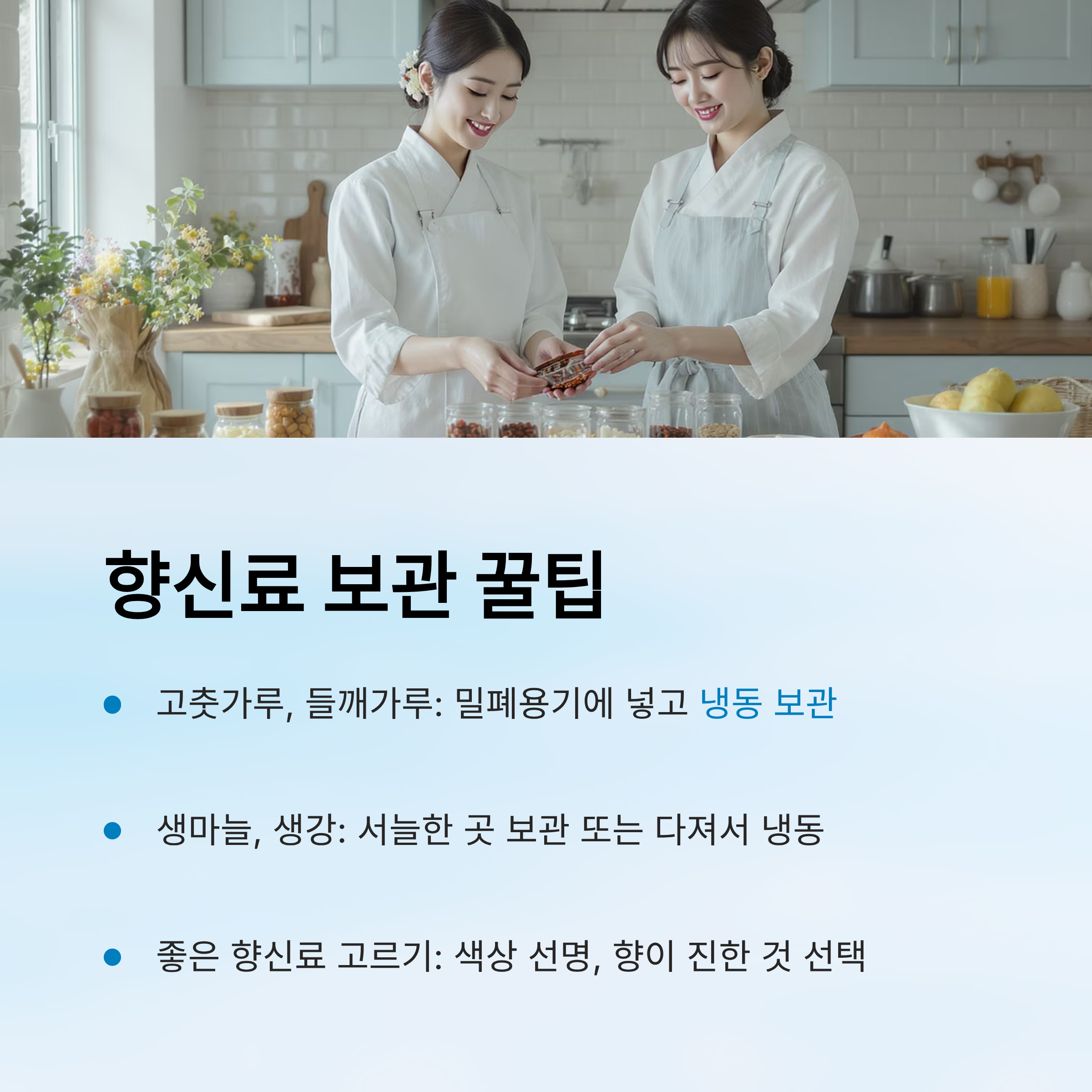 A6. 고춧가루나 들깨가루는 밀폐용기에 넣고 냉동 보관하면 향이 오래 유지돼요. 생마늘, 생강은 서늘한 곳에 보관하거나 다져서 냉동하면 좋아요.