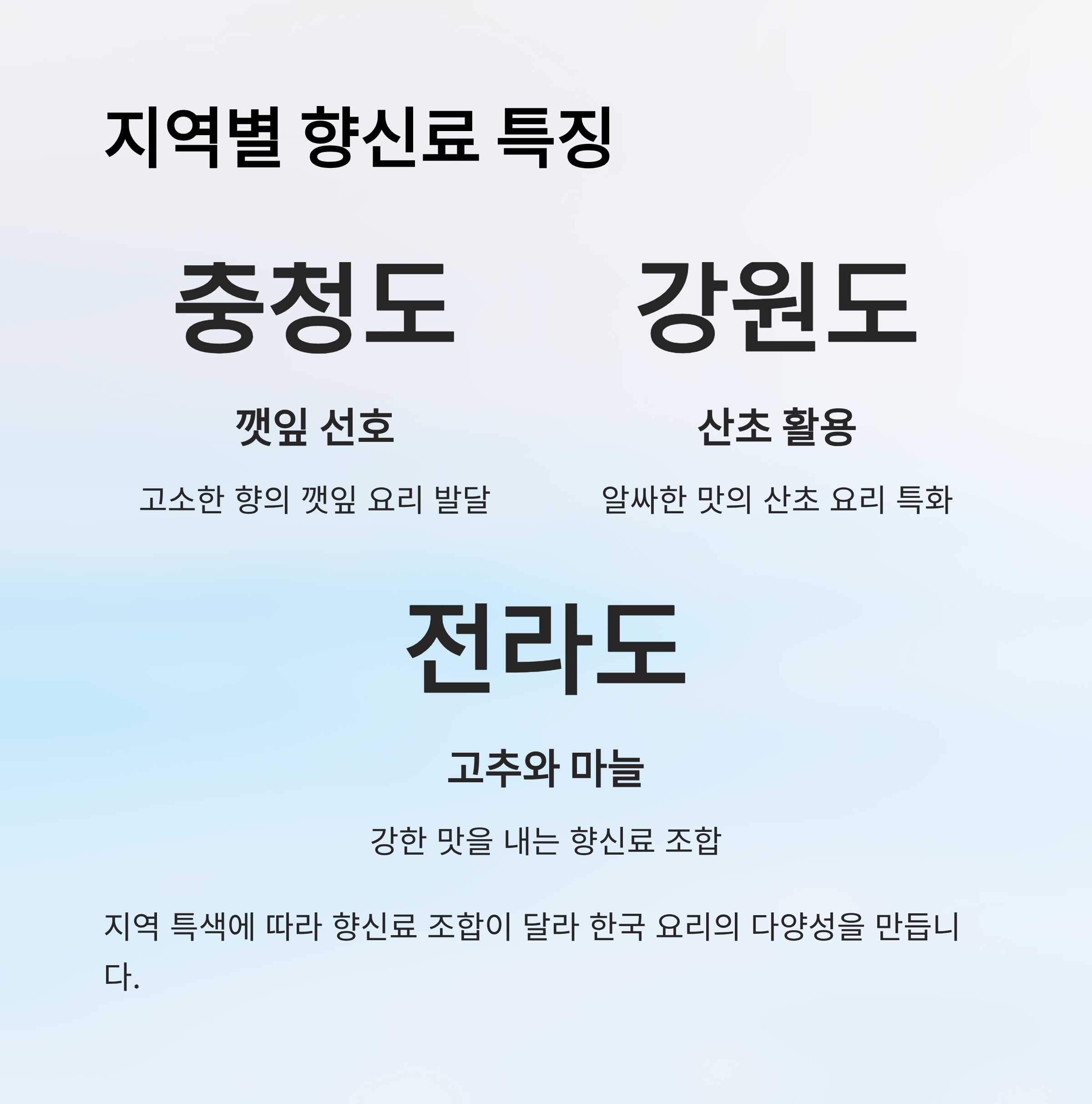 지역에 따라 선호하는 향신료도 달라요. 충청도는 깻잎을 자주 쓰고, 강원도는 산초를 즐기며, 전라도는 고추와 마늘이 강한 편이에요. 이렇게 지역 특색에 따라 향신료 조합이 다르다는 것도 한국 요리의 매력 중 하나랍니다.