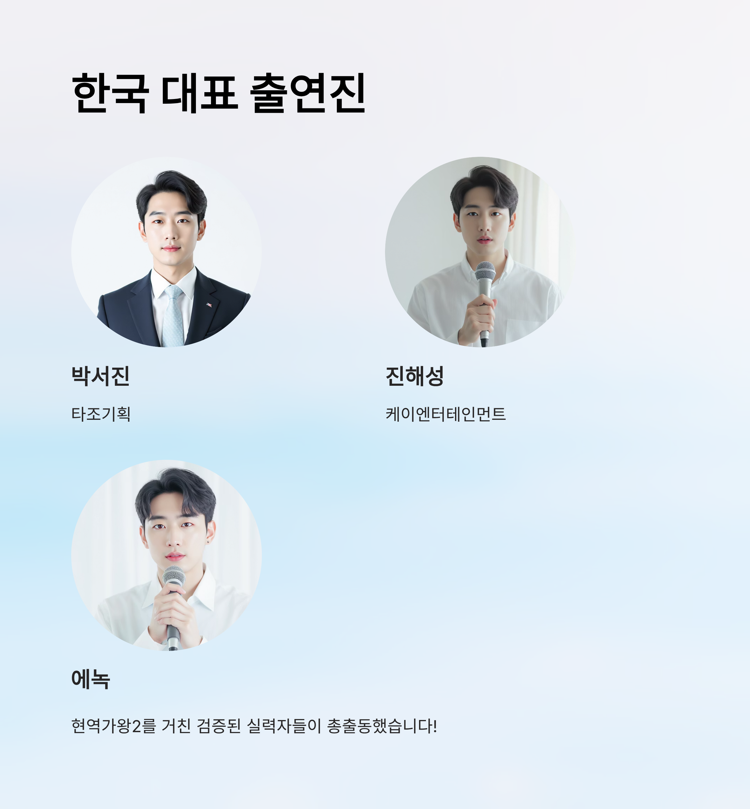 일본 대표 가수로는 트롯 아이돌 유다이(타케나카 유다이) 외에도 여러 트롯 실력자들이 출전 중이에요. 이들은 모두 자국에서 팬층이 두터운 가수들로, 각자 특색 있는 무대를 펼치고 있어요.