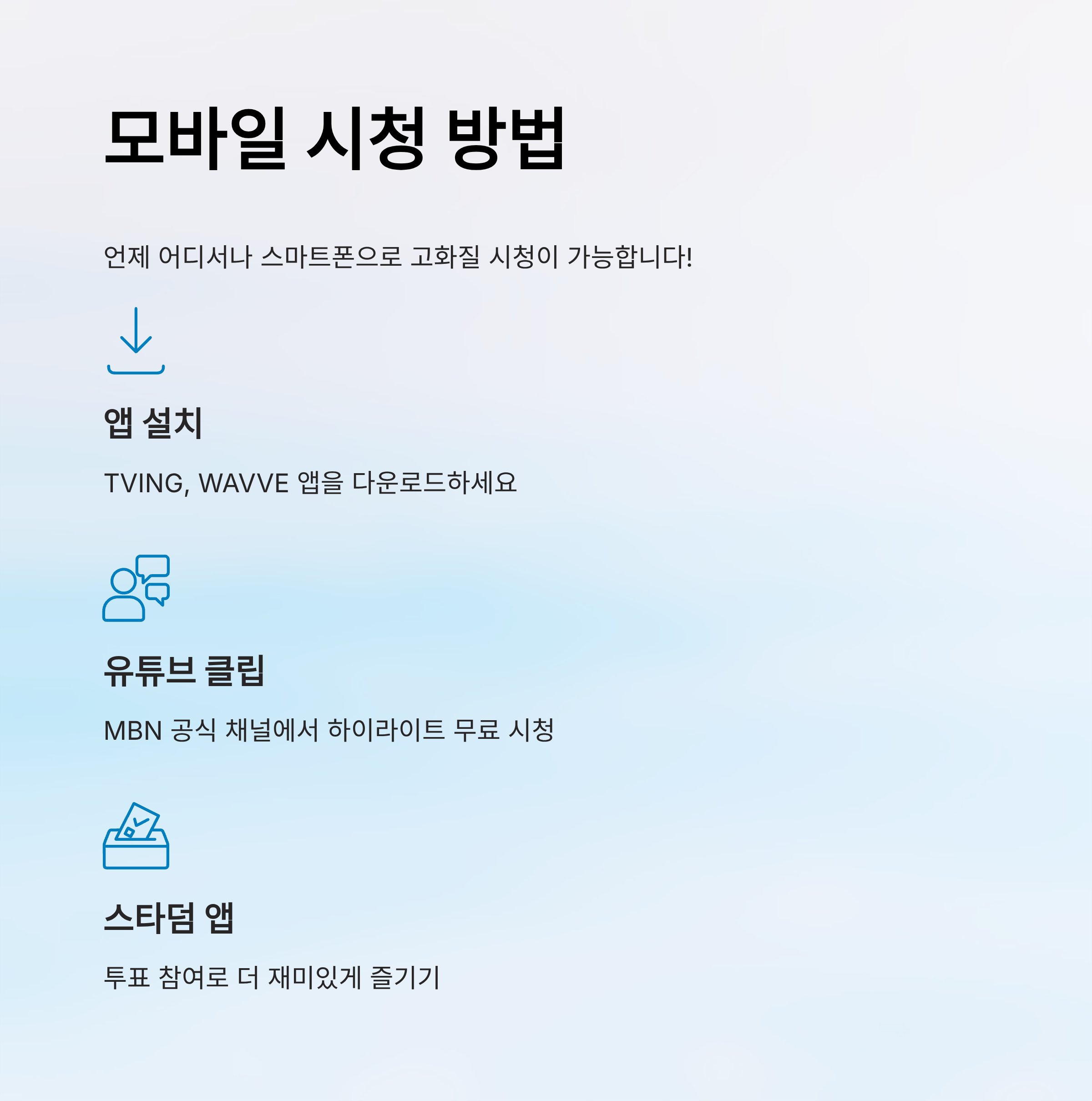 대표적인 모바일 시청 방법은 TVING 앱 또는 WAVVE 앱을 통해 보는 거예요. 이 외에도 유튜브 MBN 공식 채널에서는 일부 하이라이트 무대 영상과 클립 버전도 무료로 공개돼 있어서 간편하게 감상할 수 있어요.