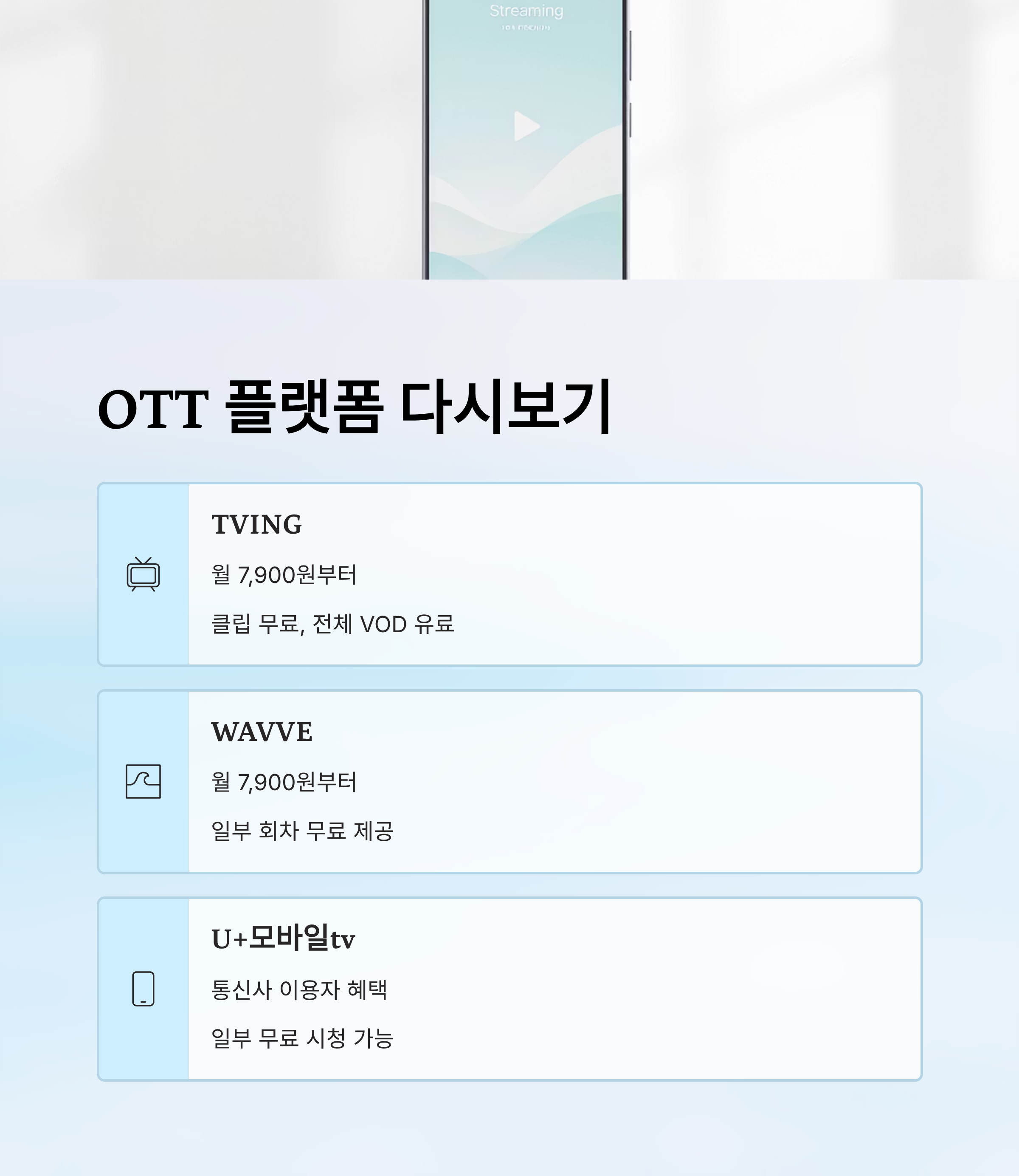 - TVING: 월 7,900원~ / 클립 무료, 전체 VOD 유료
