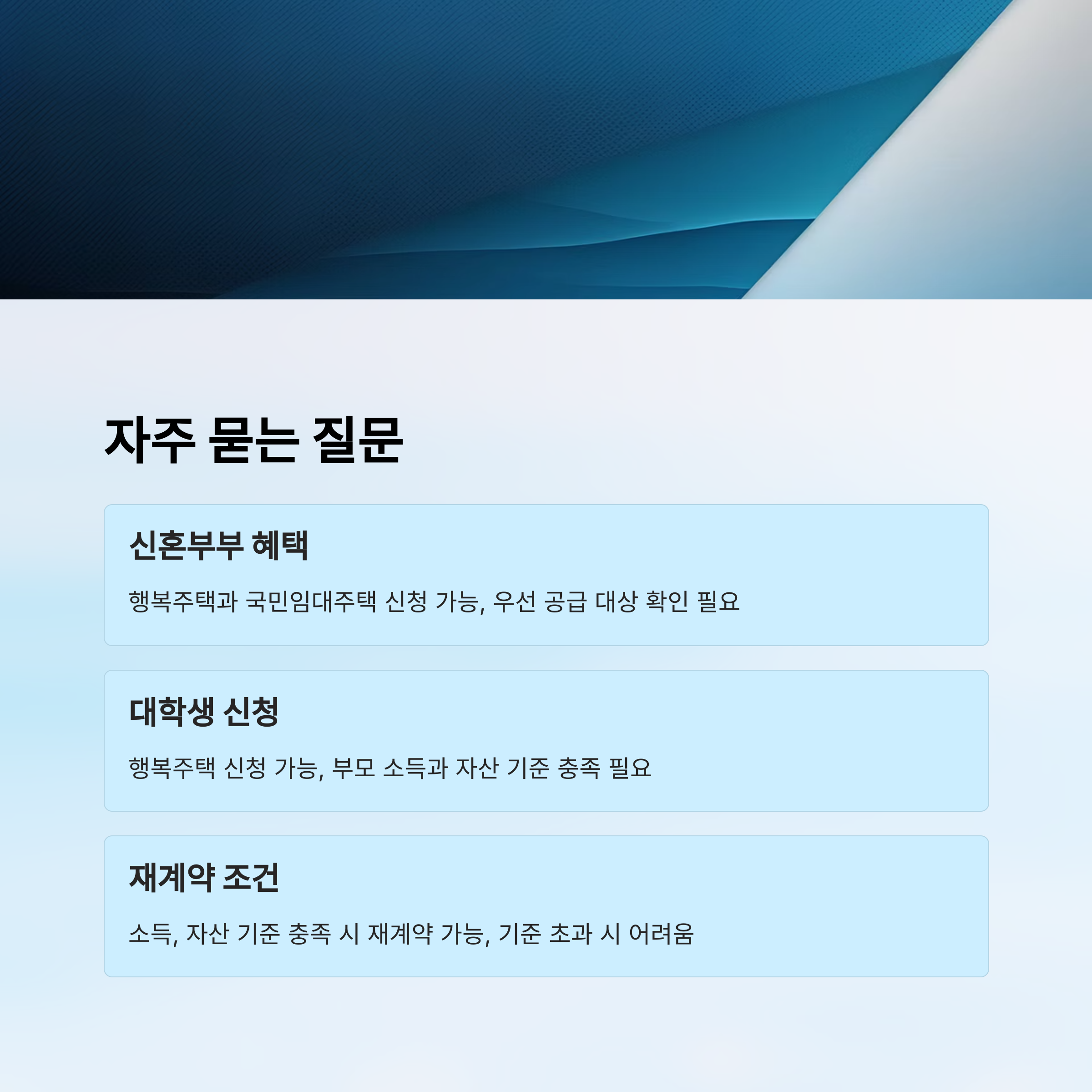 | 행복주택 | 중위소득 100% 이하 | 총 자산 3억 원 이하 | 청년, 대학생, 신혼부부 |