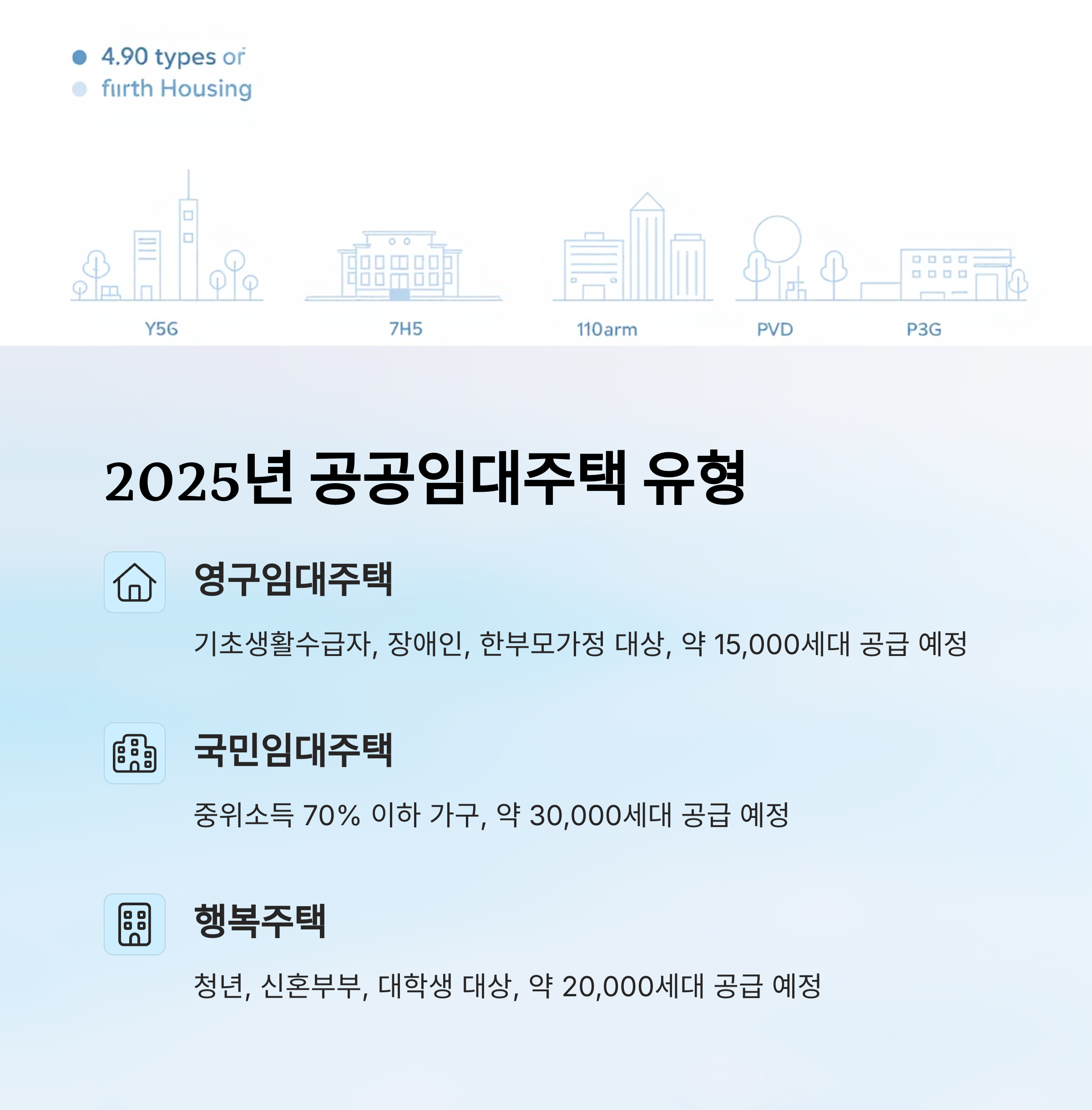 이러한 공공임대주택은 소득 수준과 연령, 가구 형태에 따라 다양한 유형으로 나뉘어요. 다음에서 2025년에 공급될 공공임대주택의 종류를 알아볼게요. 😊