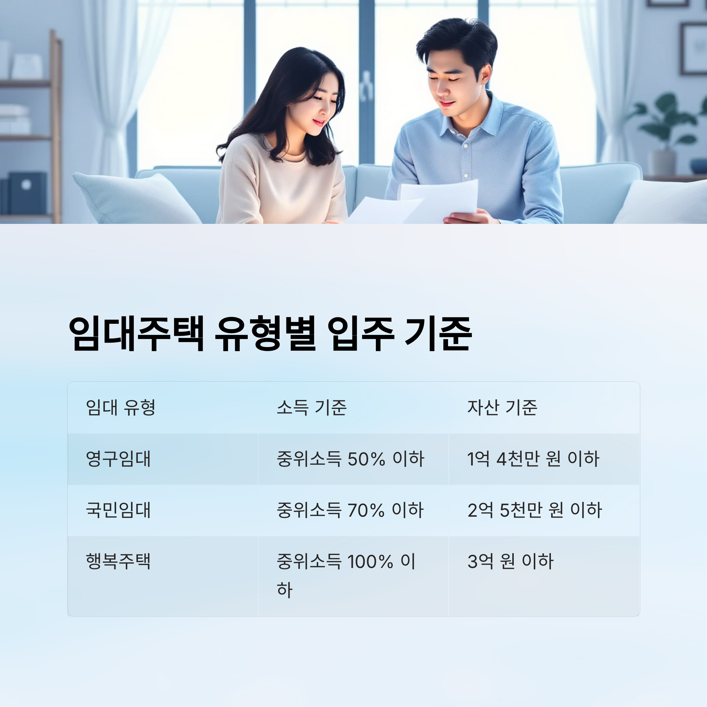 ✅ 소득 기준 충족 – 중위소득 50~100% 이하 가구 대상 (임대 유형에 따라 다름)