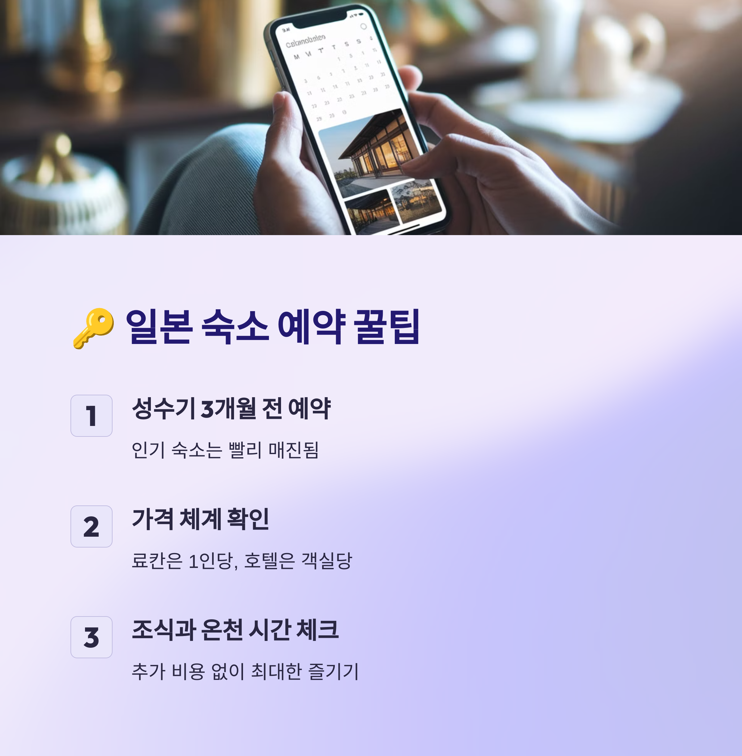 일본 소도시에서 숙소를 예약할 때는 몇 가지 팁을 알고 가면 훨씬 편하게 여행을 준비할 수 있어요. 특히 료칸이나 농가 숙소는 대도시 호텔과 예약 방식이 다를 수 있으니 미리 확인해 보세요! 🏡📅