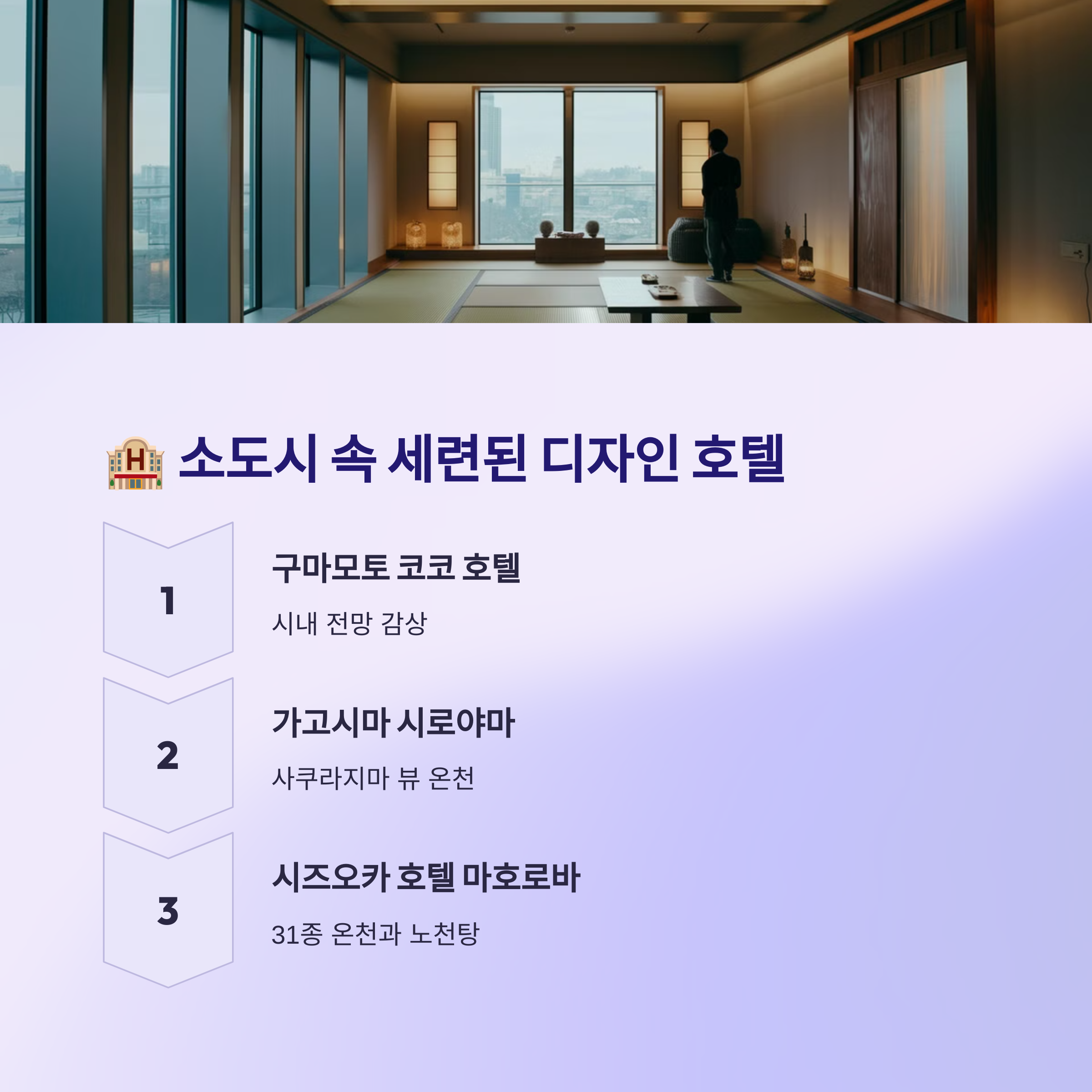 대도시 호텔과는 달리, 일본 소도시의 디자인 호텔은 지역 특색을 살린 건축과 자연 친화적인 공간이 많아요. 오래된 건물을 리모델링한 숙소, 미니멀한 감성의 모던 호텔 등 다양한 스타일이 있어요. 🌿