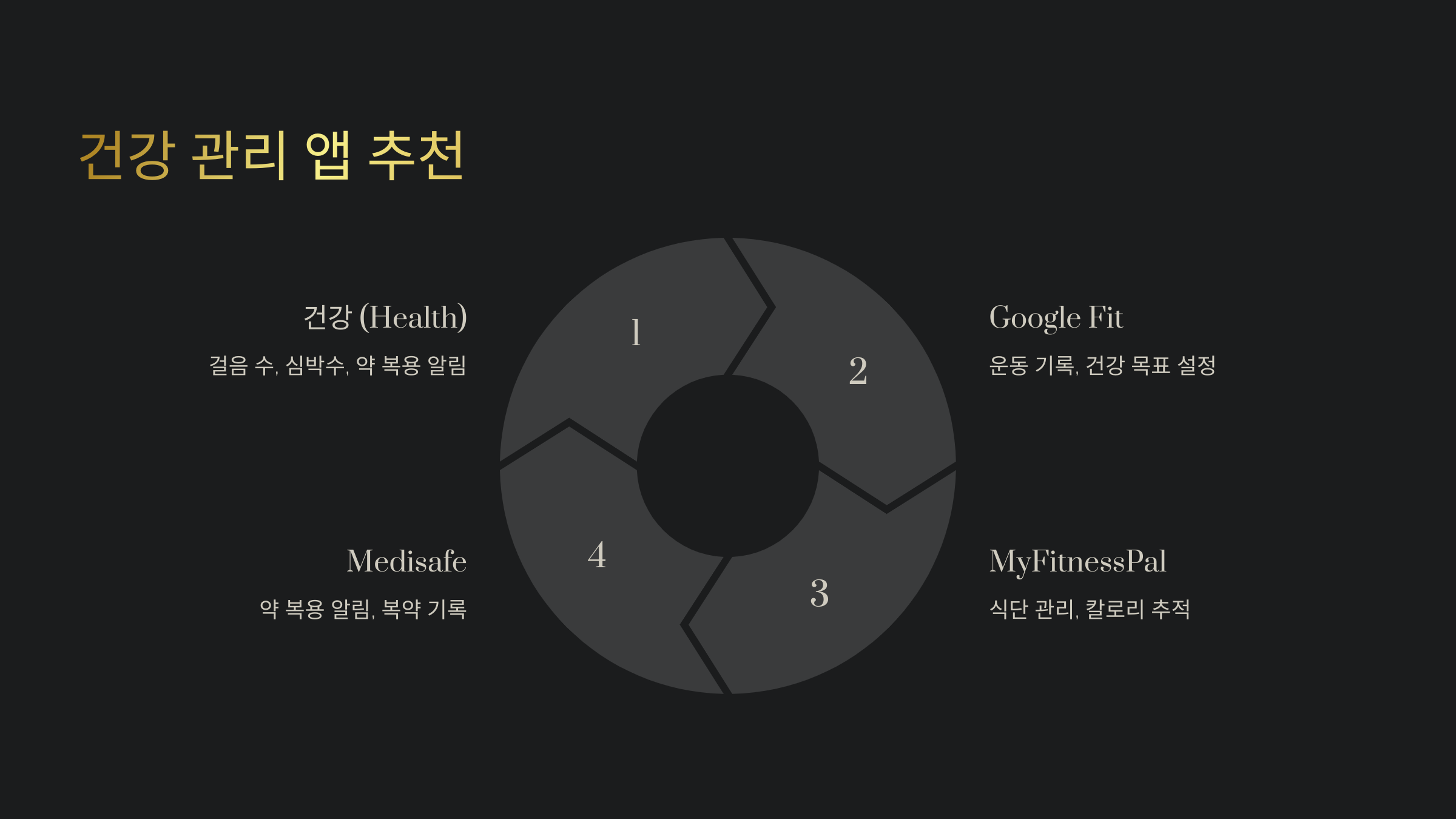 A4. '건강(Health)', 'Google Fit', 'Medisafe' 같은 앱이 좋아요. 걸음 수, 약 복용 알림, 운동 기록을 손쉽게 관리할 수 있어요.