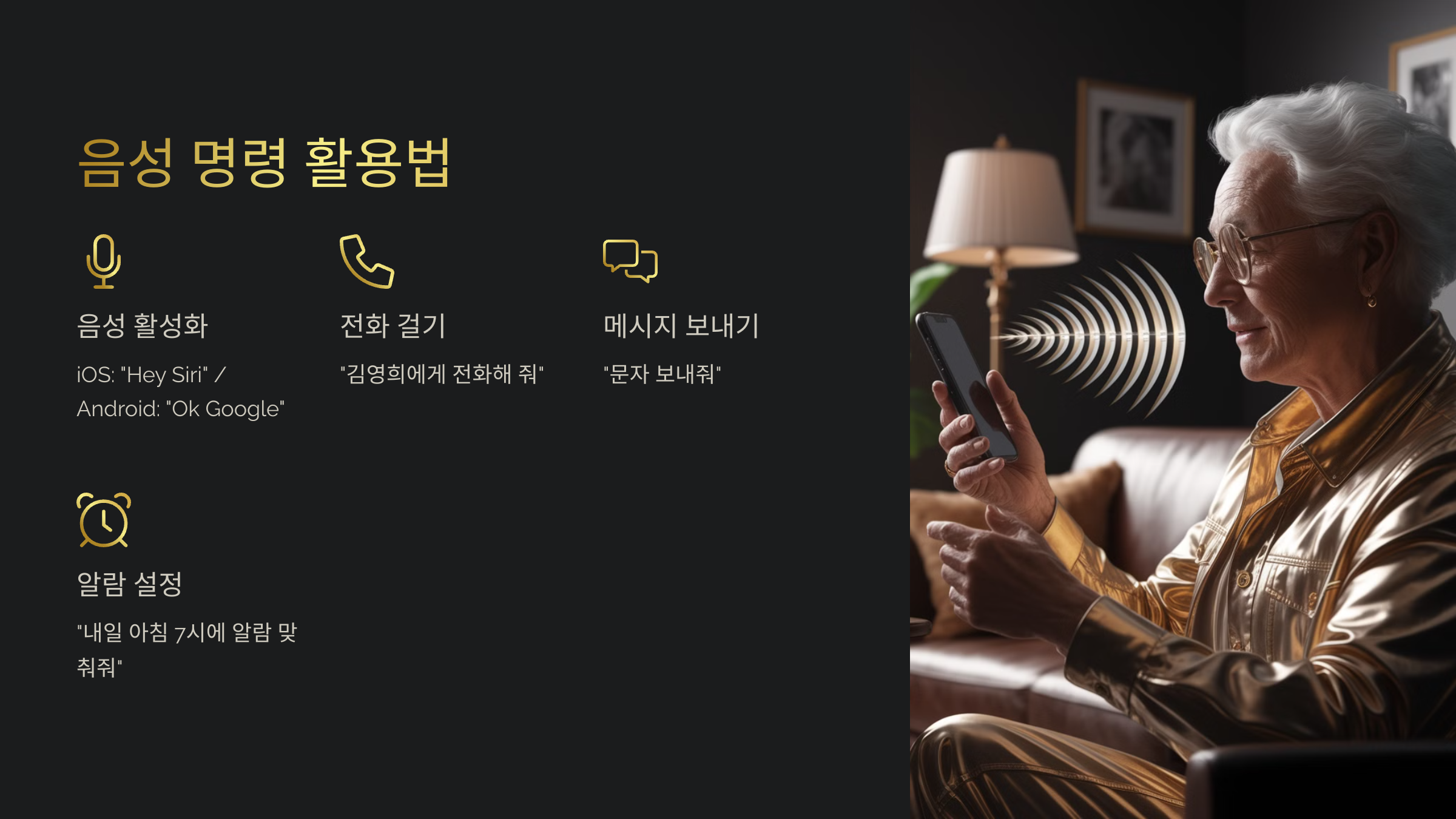 어르신들이 스마트폰을 더욱 쉽게 사용할 수 있도록 '음성 명령' 기능을 활용해 보세요. 음성만으로 전화 걸기, 메시지 보내기, 알람 설정, 날씨 확인 등 다양한 작업을 수행할 수 있어요. 🎙️😊