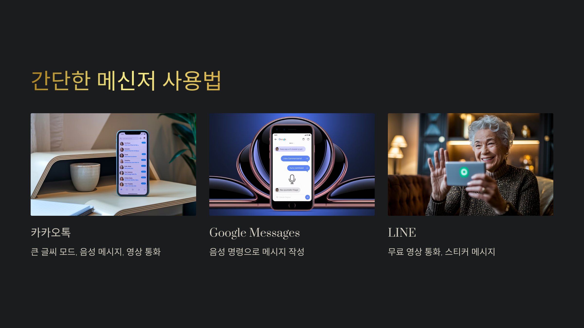 A6. '카카오톡', 'LINE', 'Google Messages', 'WhatsApp'이 있어요. 특히 '카카오톡'은 큰 글씨 모드를 제공해 어르신들이 사용하기 좋아요.