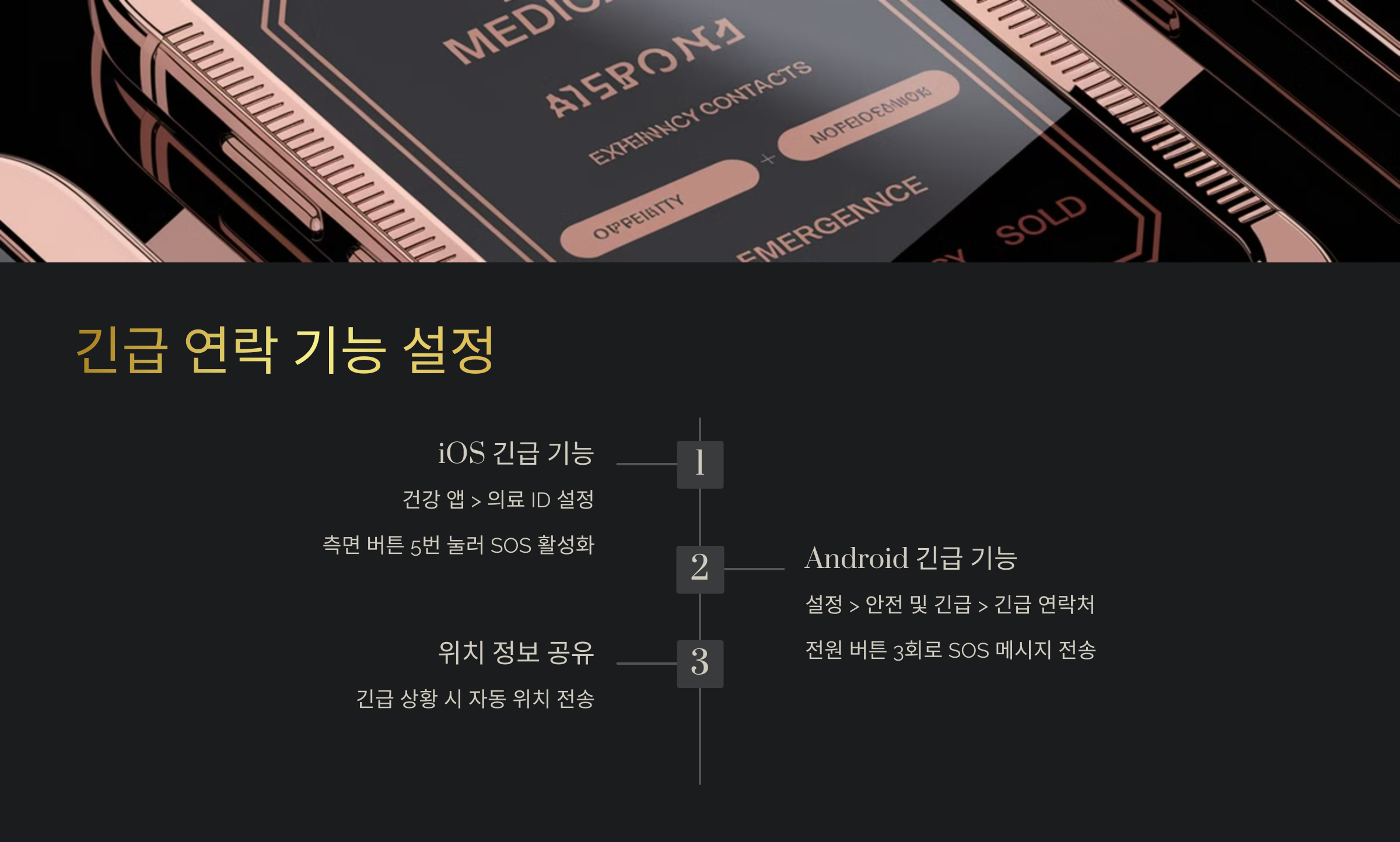 | 긴급 전화 걸기 | 측면 버튼 5회 눌러 SOS | 전원 버튼 3회 눌러 SOS 메시지 |