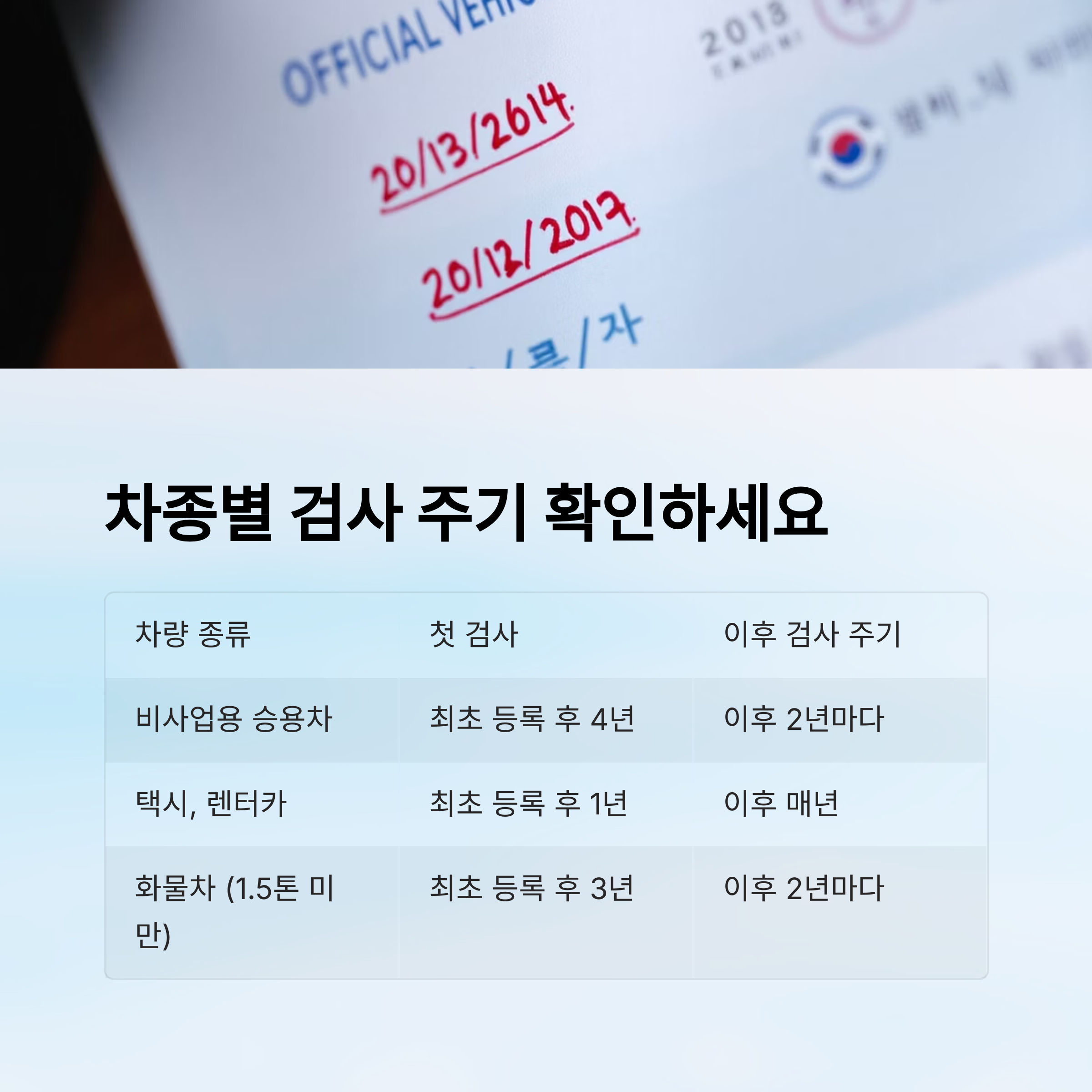 | 차량 종류 | 첫 검사 | 이후 검사 주기 |