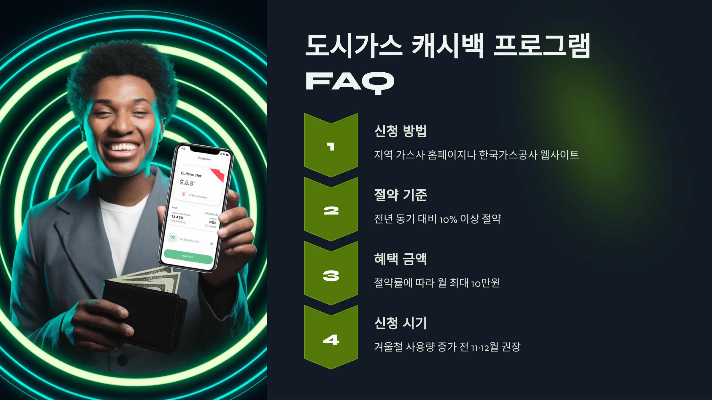 A1. 도시가스 캐시백 신청은 각 지역 가스사 홈페이지나 한국가스공사 공식 웹사이트를 통해 할 수 있어요. 신청 후 자동으로 사용량이 모니터링돼요.