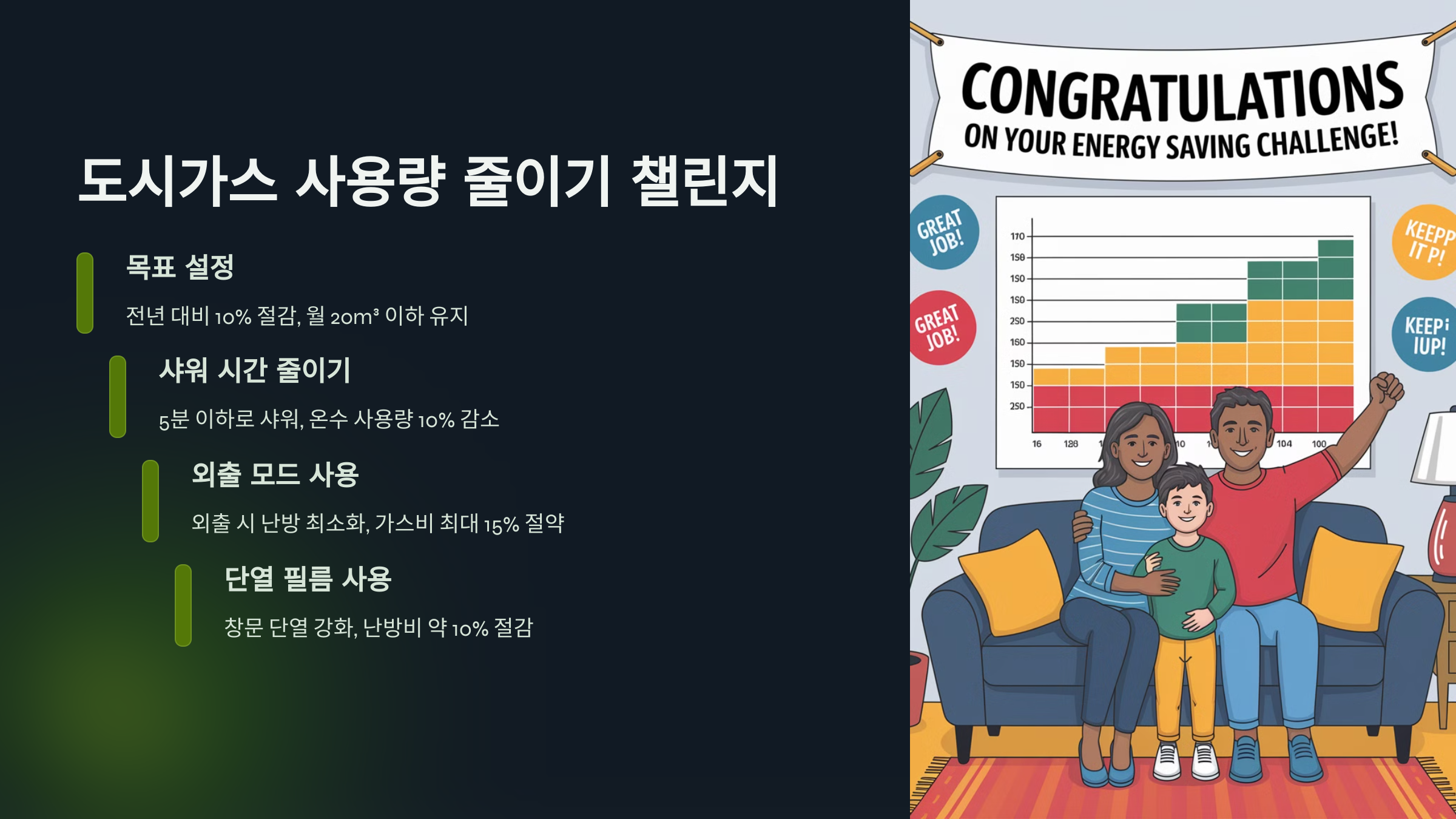 가족과 함께 참여하면 더 재미있어요. 각자 샤워 시간을 줄이거나, 보일러 외출 모드 사용하기, 단열 필름 부착 등 미션을 설정하고, 절약한 만큼 작은 보상을 주는 게임처럼 진행할 수도 있어요.