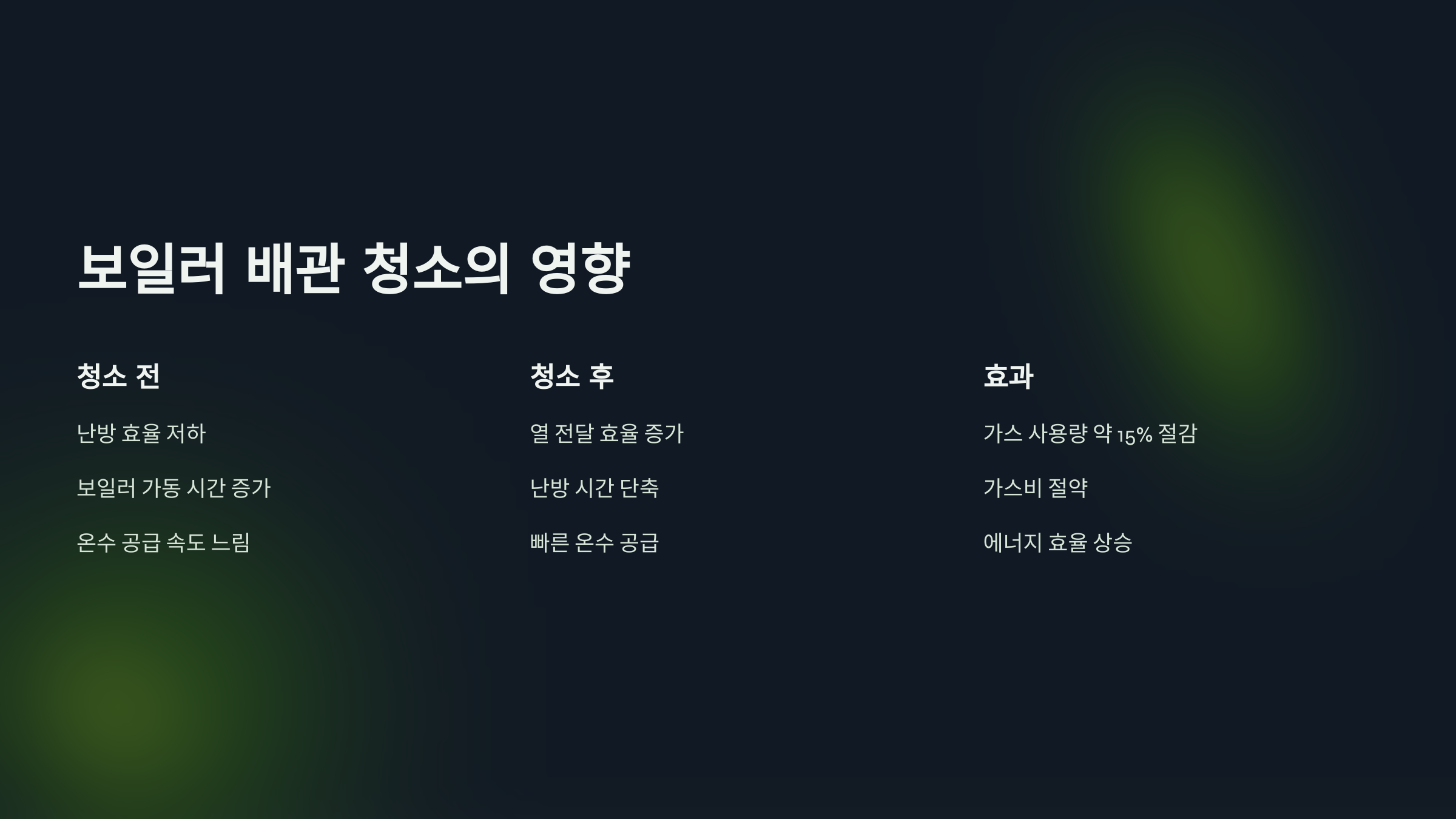 | 난방 효율 저하 | 열 전달 효율 증가 | 가스 사용량 약 15% 절감 |